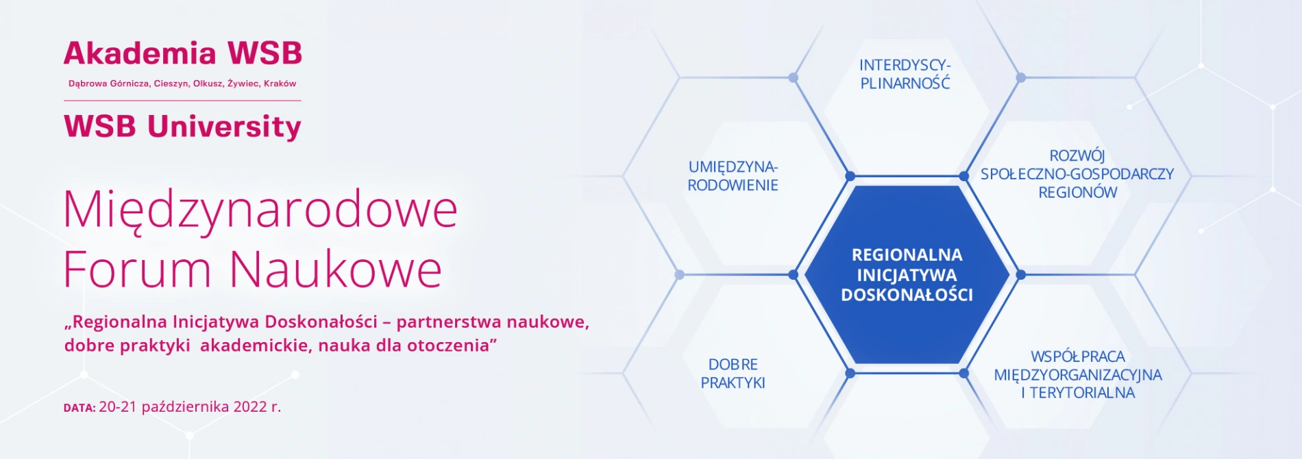 Międzynarodowe Forum Naukowe pn. „Regionalna Inicjatywa Doskonałości – partnerstwa naukowe, dobre praktyki akademickie, nauka dla otoczenia”, odbędzie się w ramach Jubileuszu 4. rocznicy realizacji programu Ministra Edukacji i Nauki pod nazwą „Regionalna Inicjatywa Doskonałości”. Wydarzenie odbędzie się w dniach 20-21 października 2022 r. w Akademii WSB.