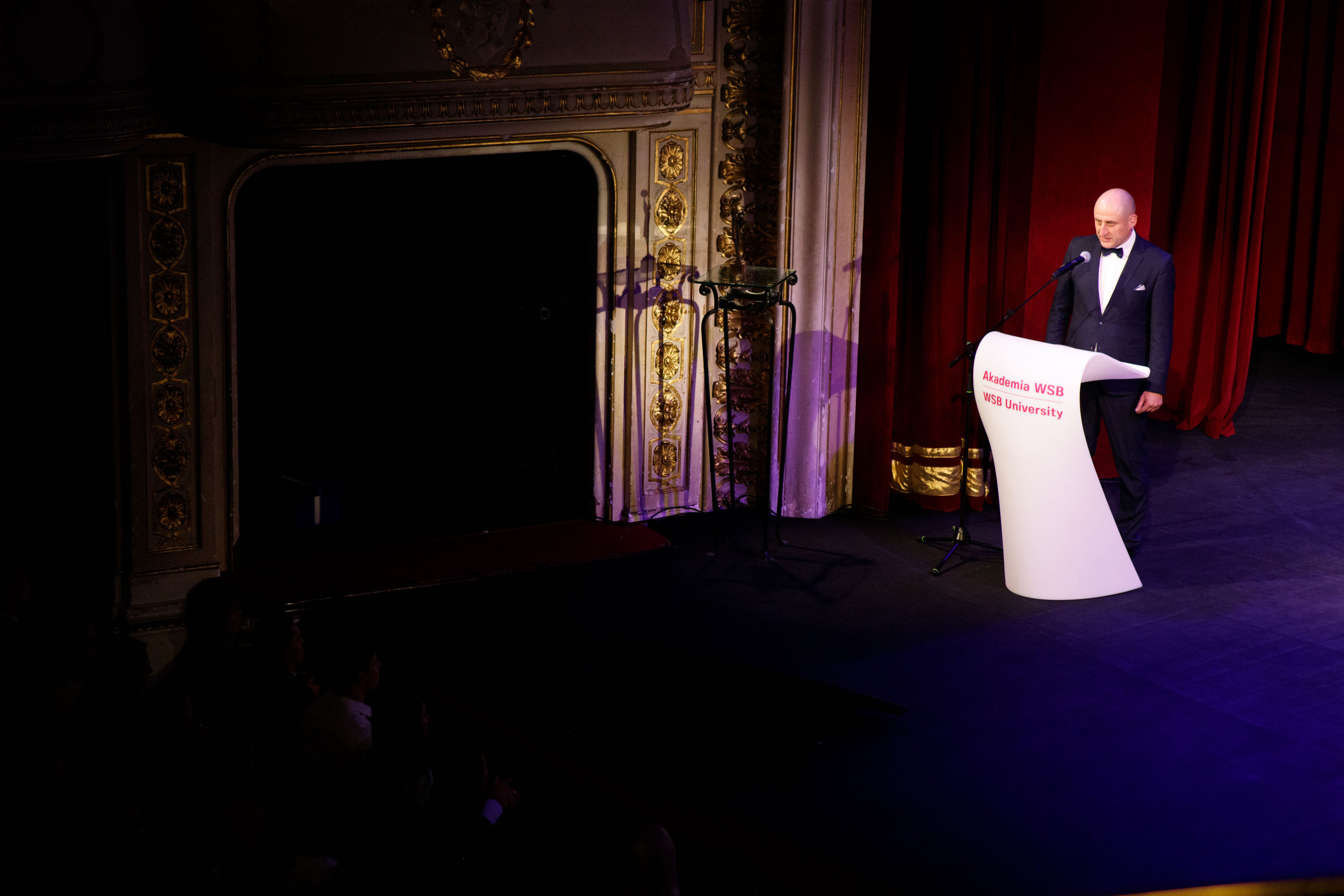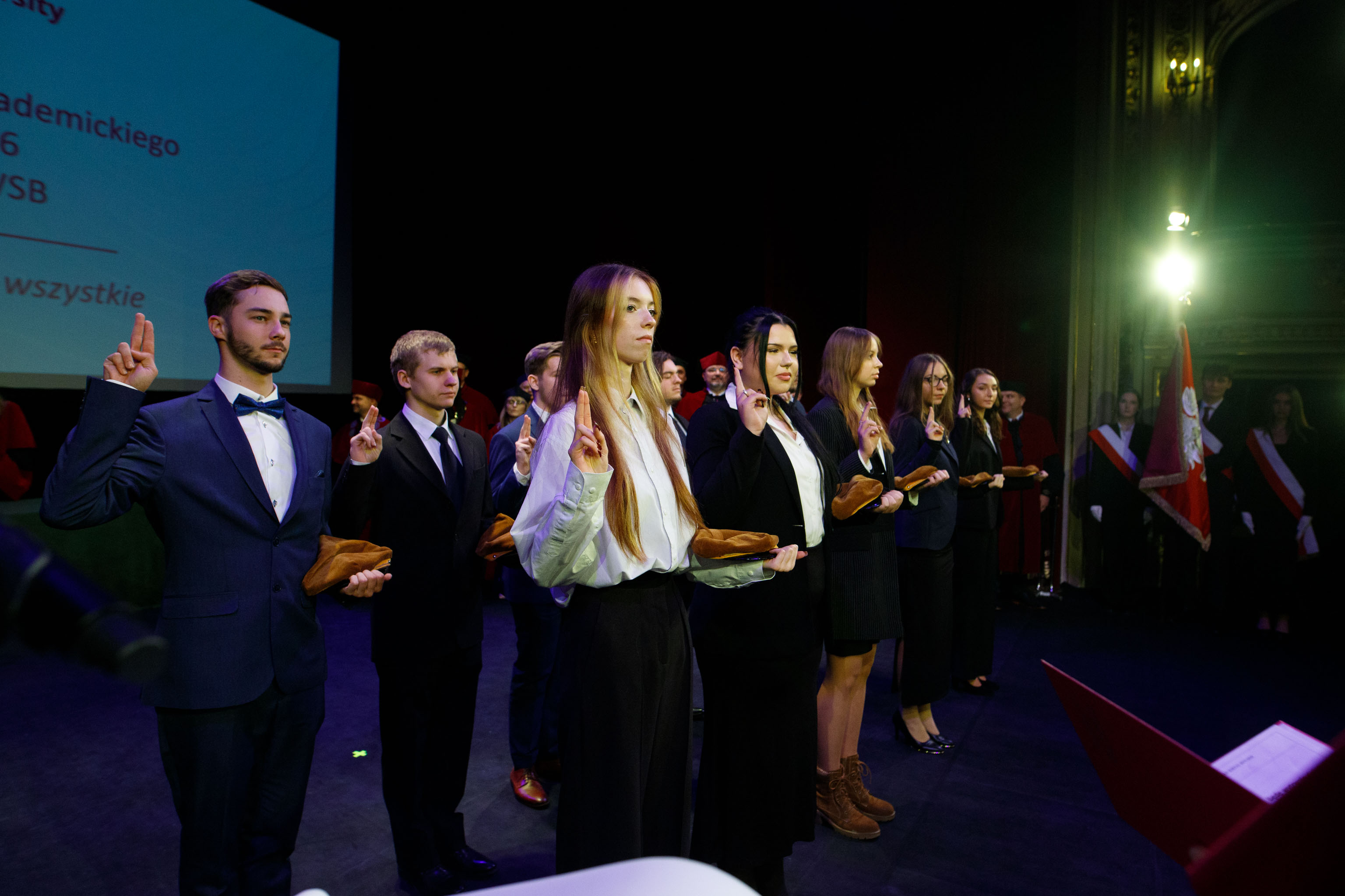 Szczególnym punktem uroczystości była immatrykulacja – moment, w którym nowo przyjęci studenci stali się częścią społeczności akademickiej Akademii WSB. Akt ślubowania poprowadził prof. Marcin Lis, Prorektor ds. Studenckich i Współpracy z Otoczeniem, a słowa przysięgi wypowiedziane przez studentów wybrzmiały z dumą i zaangażowaniem.