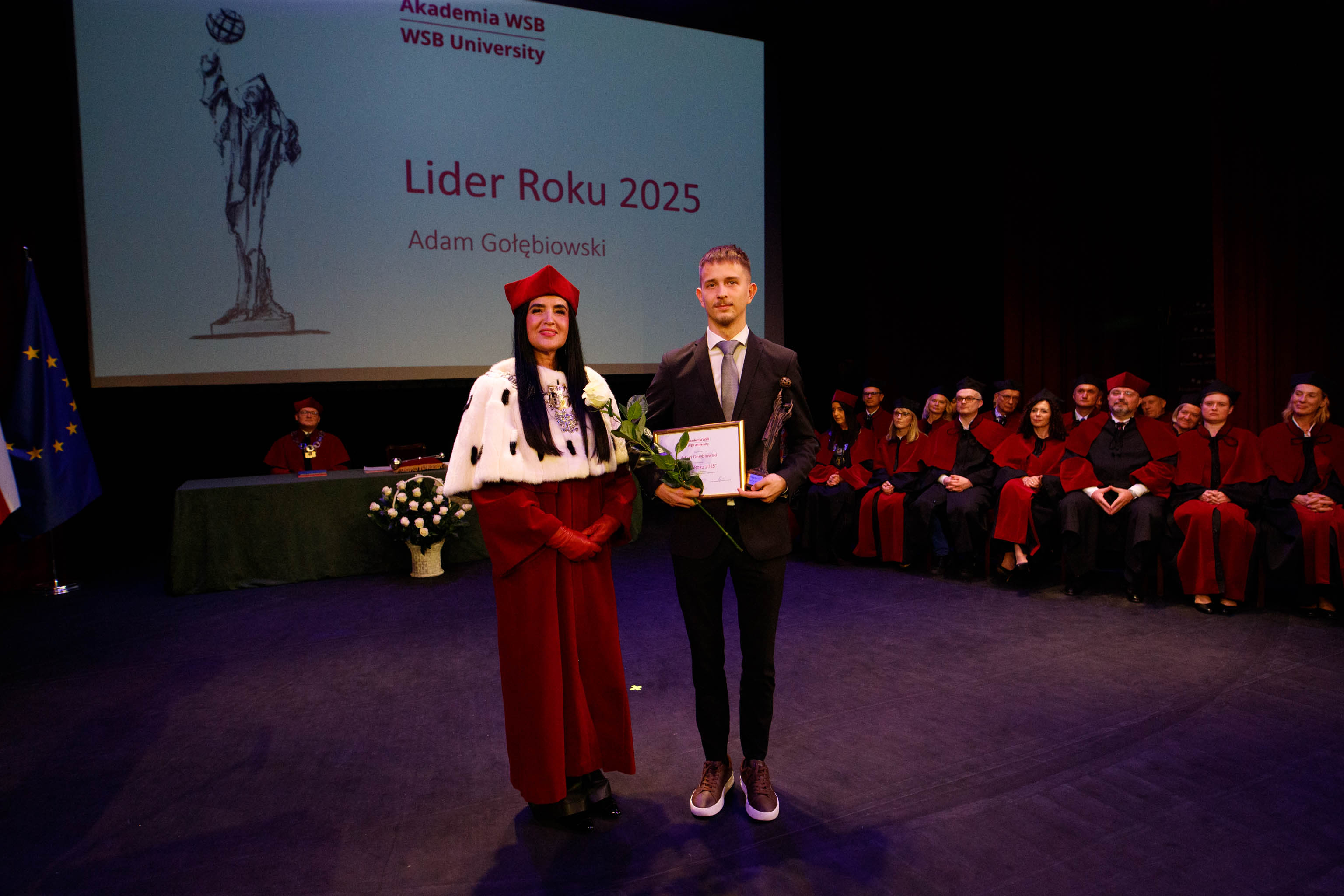 Tytuł Lidera Roku 2025 otrzymał Pan Adam Gołębiowski, absolwent kierunku Zarządzanie, przewodniczący Koła Naukowego ProjectGO, autor publikacji naukowych i uczestnik licznych konferencji. Jego działalność badawcza, organizacyjna i społeczna stanowi przykład konsekwencji, pasji i przywództwa akademickiego.
