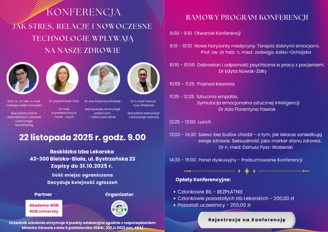 Wśród prelegentów znaleźli się uznani specjaliści – dr Dariusz Pysz-Waberski oraz dr Edyta Nowak-Żółty, którzy podzielą się swoją wiedzą i doświadczeniem w zakresie zdrowia psychicznego, relacji międzyludzkich oraz wpływu nowoczesnych technologii na nasze samopoczucie. Ich wystąpienia pozwolą uczestnikom lepiej zrozumieć, jak codzienne napięcia, tempo życia i cyfrowa rzeczywistość kształtują nasze emocje oraz zdolność do budowania więzi.