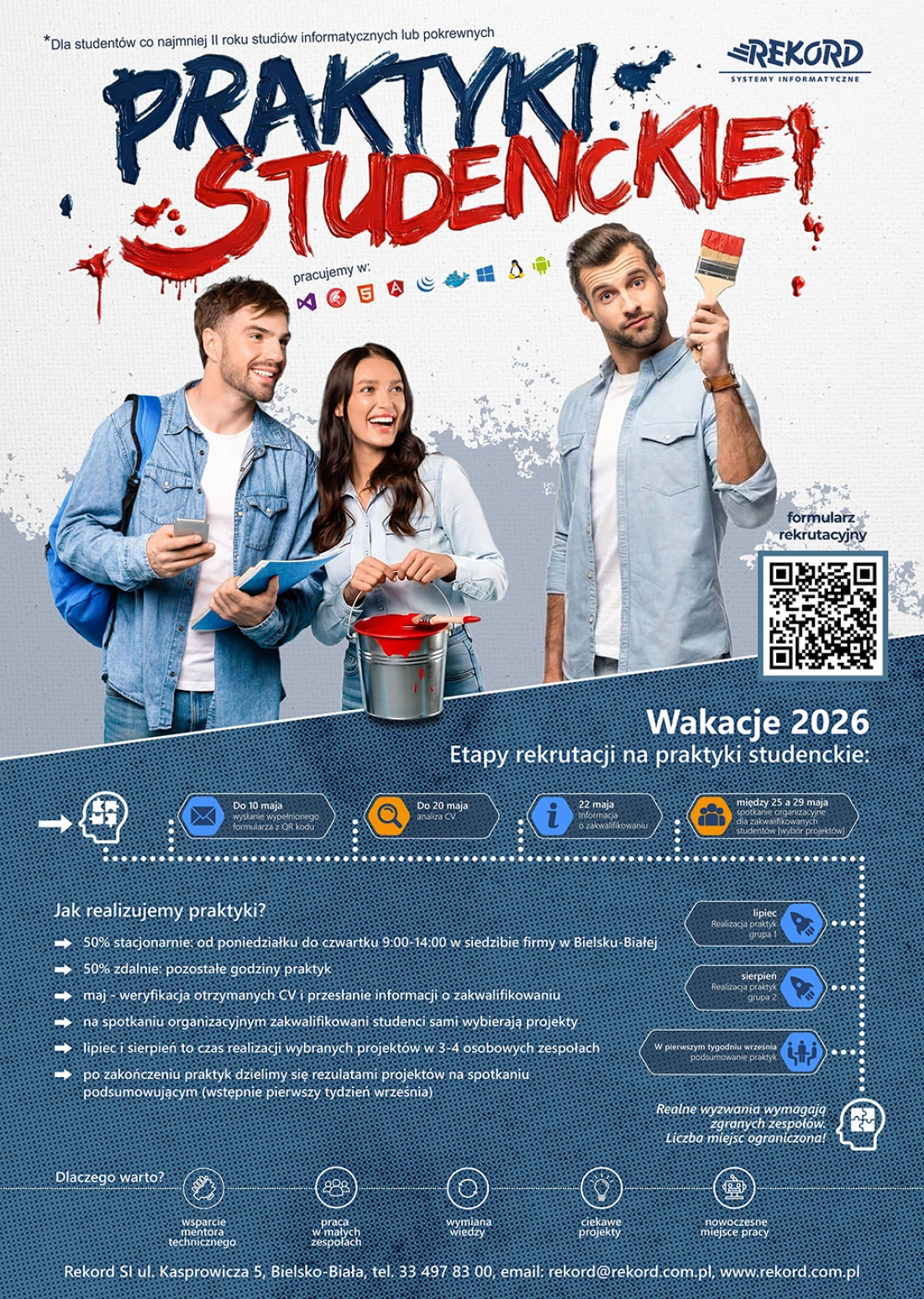 Proces rekrutacji do programu praktyk w firmie Rekord rozpoczyna się od przesłania formularza zgłoszeniowego, następnie analizowane są aplikacje, a wybrani kandydaci otrzymują informację o zakwalifikowaniu. Kolejnym etapem jest spotkanie organizacyjne, podczas którego studenci poznają szczegóły współpracy oraz samodzielnie wybierają projekty, nad którymi będą pracować.