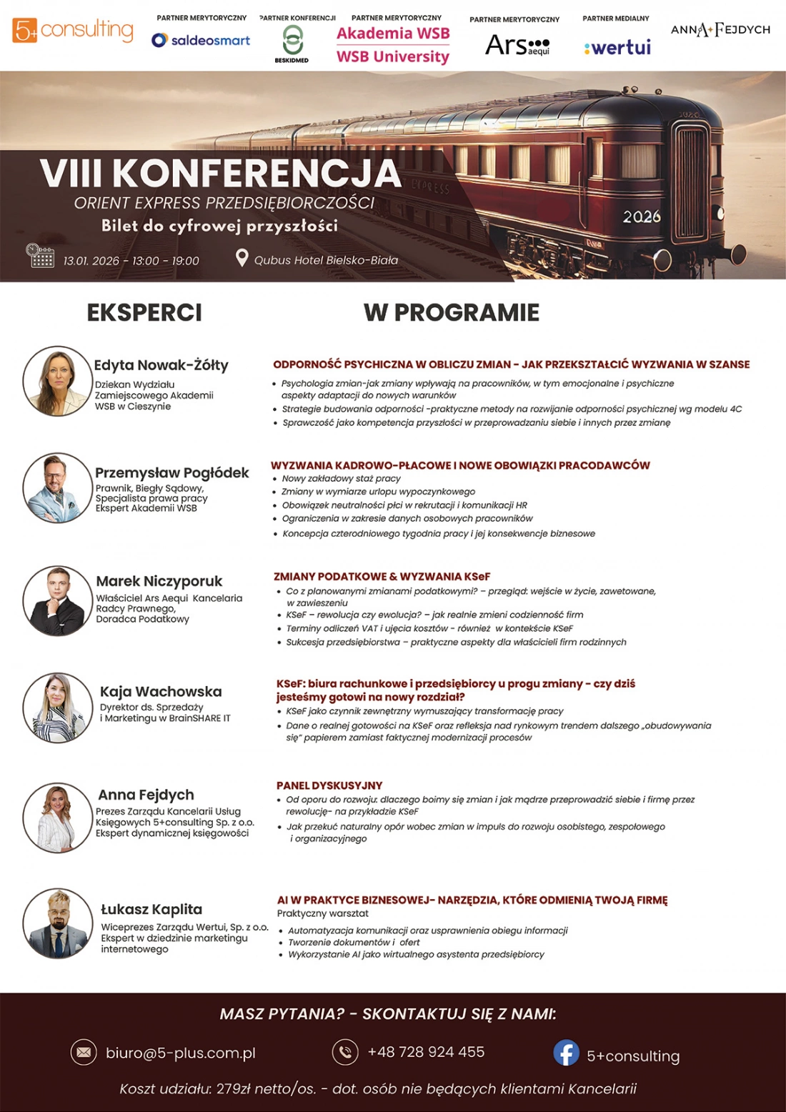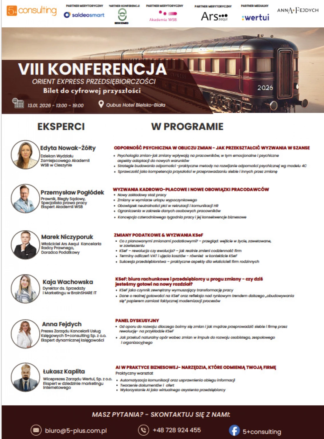 Konferencja, organizowana przez 5+ Consulting (Kancelaria Usług Księgowych 5+ consulting) pod przewodnictwem Anny Fejdych – prezes zarządu i autorki koncepcji Dynamiczna Księgowość – stanowi część ogólnopolskiego cyklu Orient Express Przedsiębiorczości, którego ideą jest wspieranie przedsiębiorców w świadomym wyznaczaniu kierunku rozwoju biznesu na nadchodzące lata.