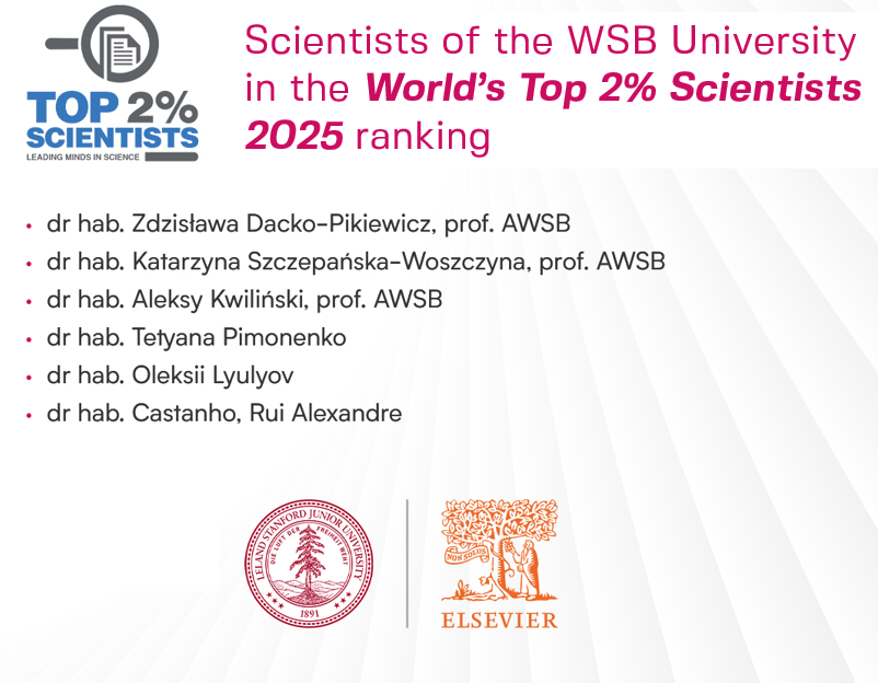 Scientists from the WSB University have been included in the World's Top 2% Scientists ranking among distinguished figures of the global scientific community. The list is based on a ranking that encompasses the top 2% of the most highly rated researchers worldwide or 100,000 scientists with the highest c-score. This prestigious compilation identifies the leading scientists in the world, representing approximately 2% of the global research community. The ranking is based on standardized data concerning the number of citations, the h-index, and a range of other bibliometric indicators that reflect the impact and significance of each researcher’s scientific achievements.