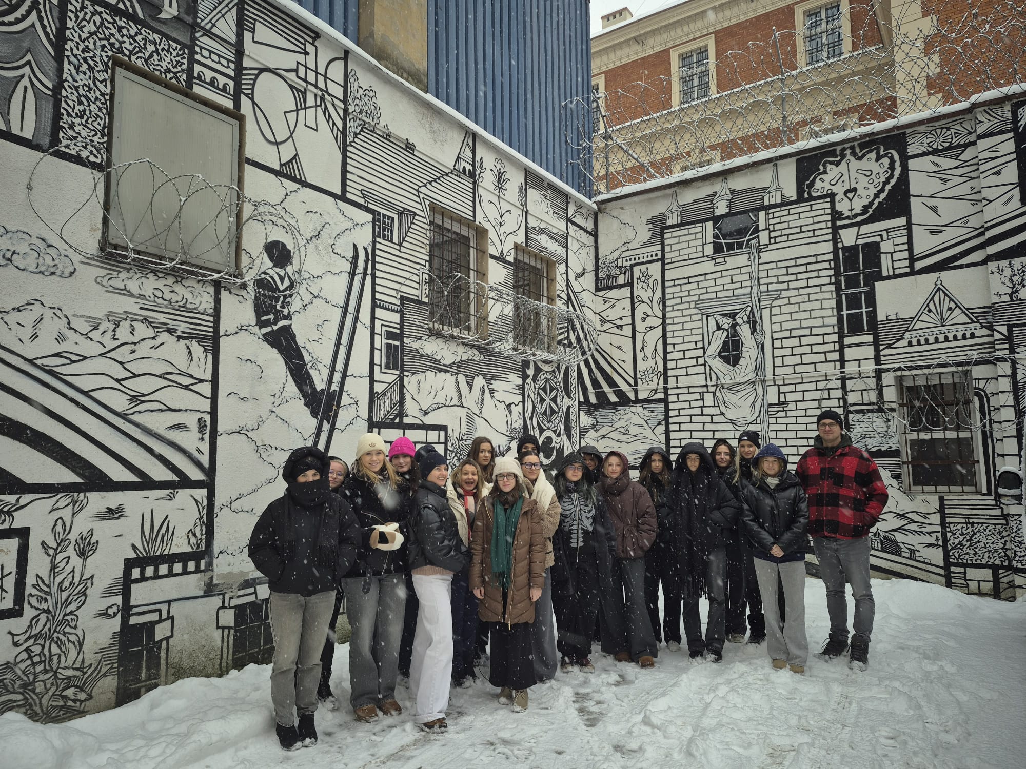 Na terenie aresztu studenci mogli również zobaczyć mural autorstwa dr. Kamila Kuzko, który w szczególny sposób wpisuje się w przestrzeń penitencjarną i prowokuje do myślenia o granicach wolności, winy i kary.