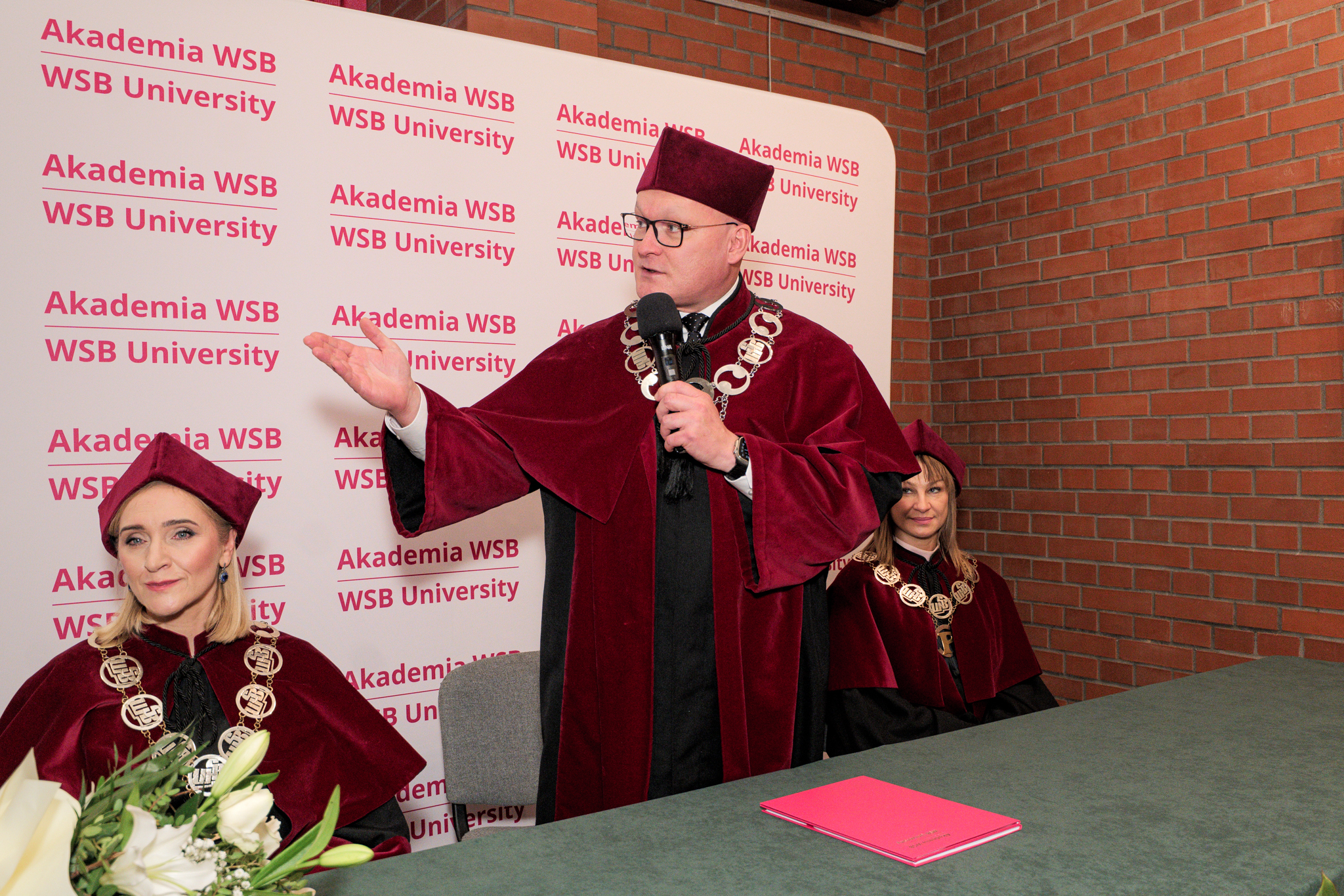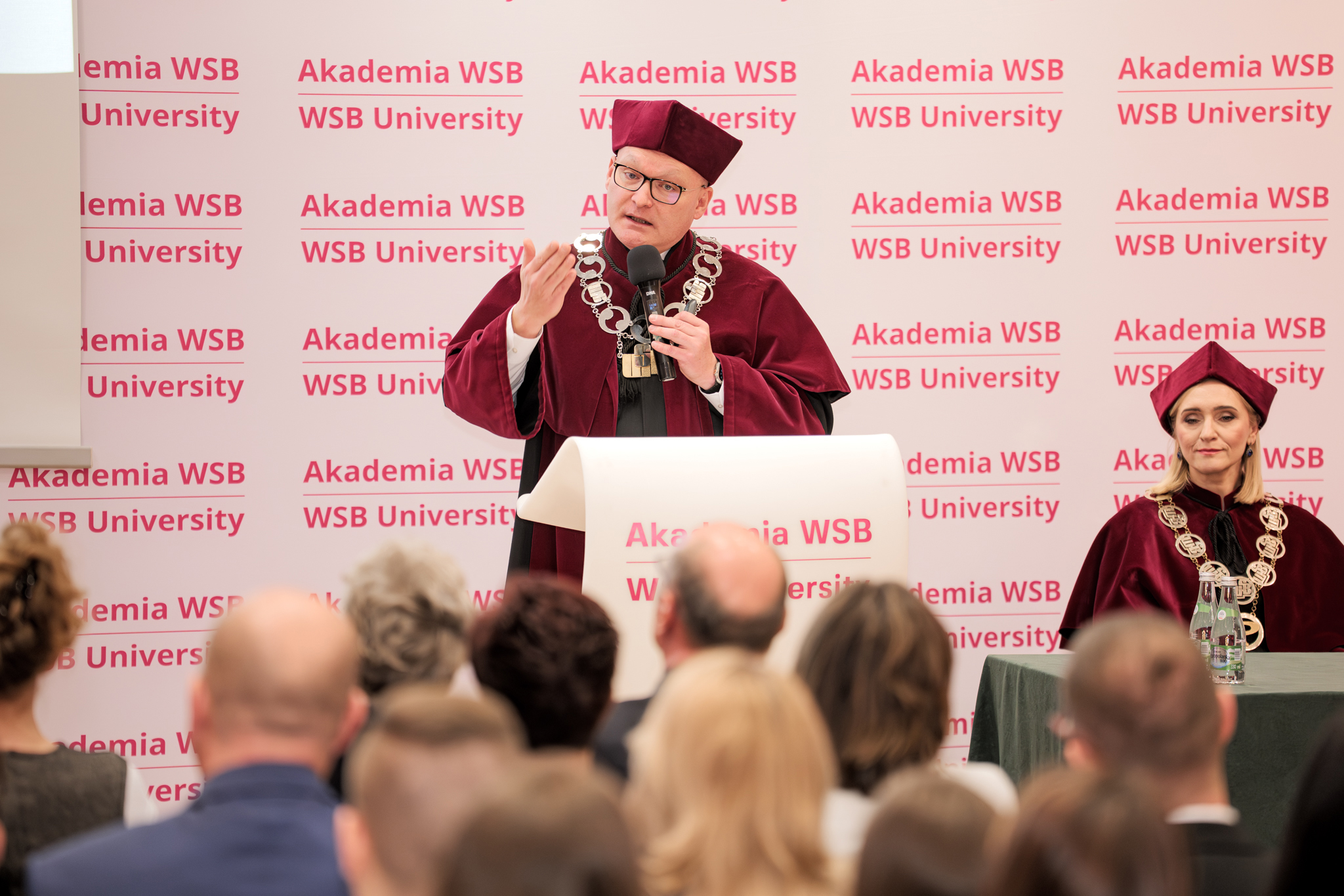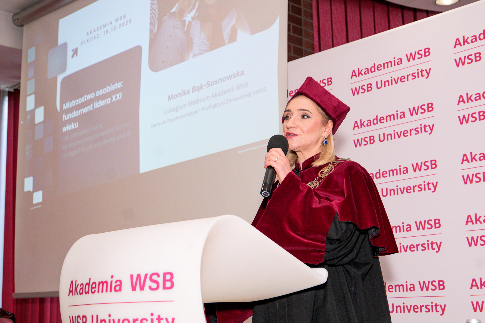 Zwieńczeniem uroczystości był wykład inauguracyjny prof. dr hab. Moniki Bąk-Sosnowskiej, Dyrektor Centrum Psychosomatyki i Profilaktyki Zdrowotnej Akademii WSB, pt. „Mistrzostwo osobiste: fundament lidera XXI wieku. Jak zarządzać sobą, by skutecznie przewodzić innym i osiągać to, co naprawdę ważne”. Inspirujące wystąpienie spotkało się z dużym zainteresowaniem uczestników i stanowiło wartościowe zakończenie uroczystości.