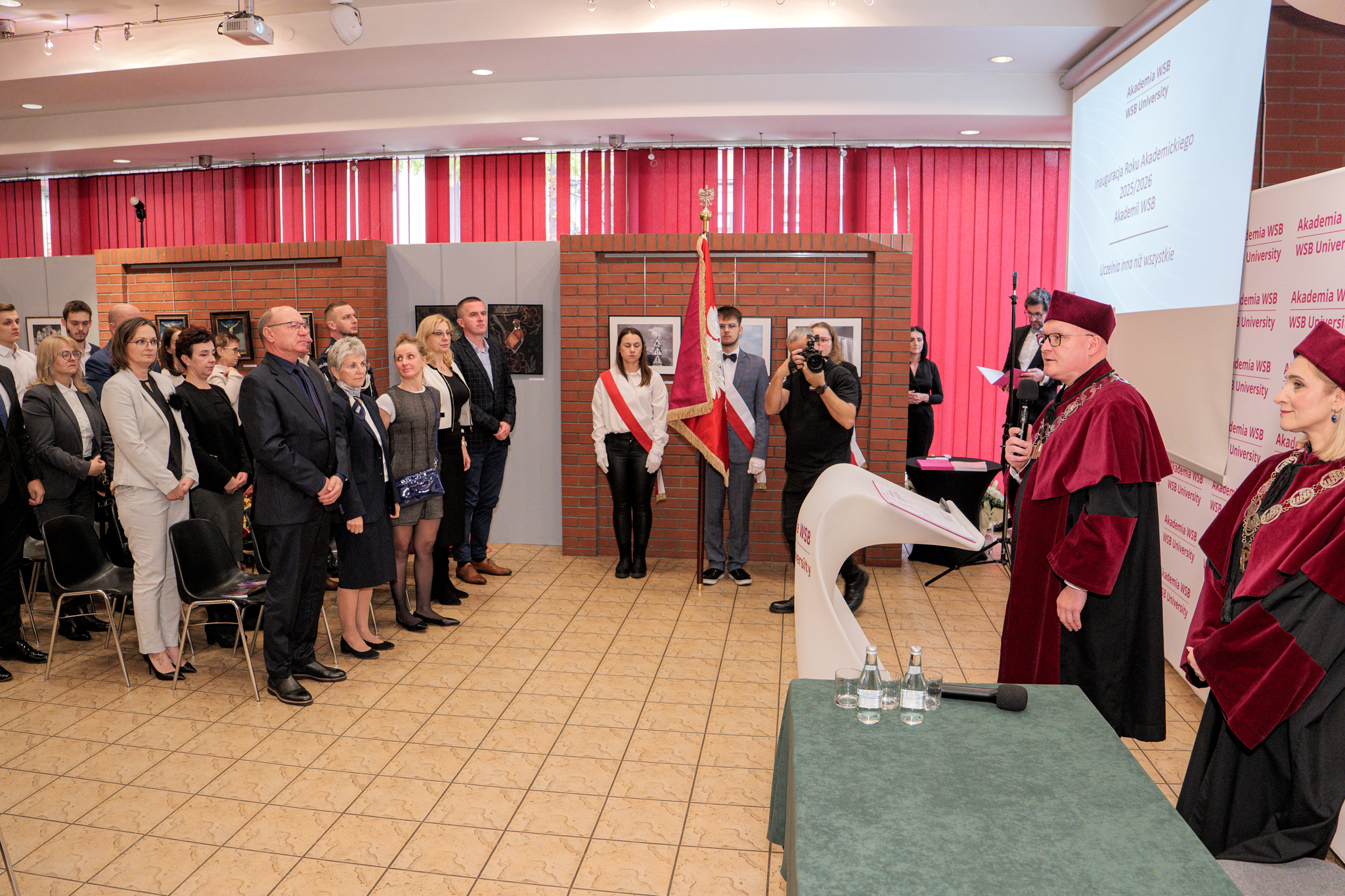 Uroczystość otworzył dr hab. Marcin Lis, prof. AWSB – Prorektor ds. Studenckich i Współpracy z Otoczeniem, który w swoim przemówieniu powitał zebranych i oficjalnie zainaugurował nowy rok akademicki, wypowiadając tradycyjną formułę: „Quod Bonum, Felix, Faustum Fortunatumque sit – Oby wypadło dobrze, szczęśliwie i pomyślnie.”