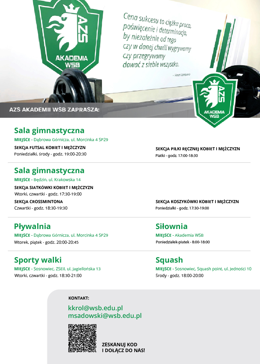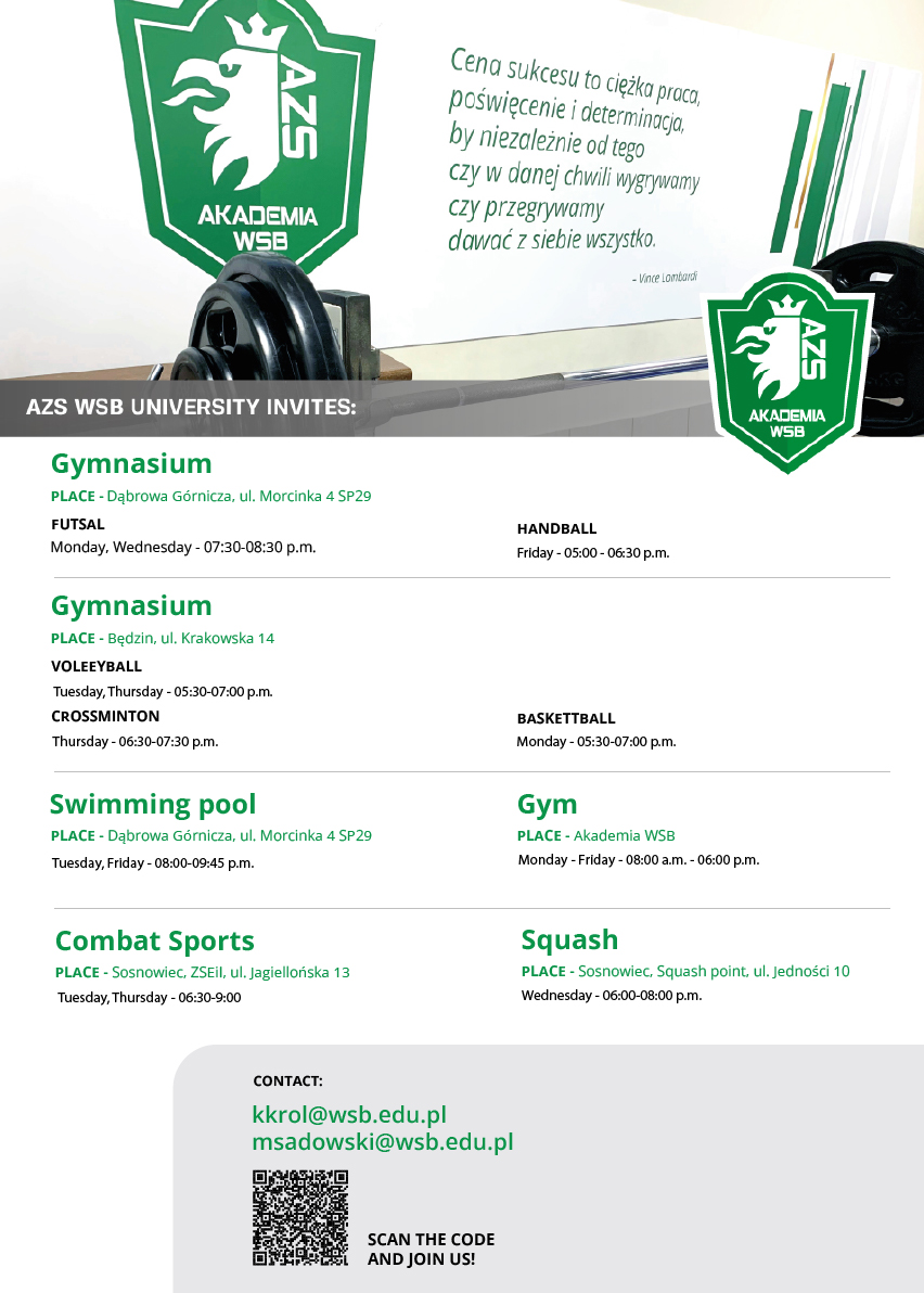 Serdecznie zapraszamy wszystkich studentów, absolwentów oraz sympatyków sportu do udziału w zajęciach i wspólnego rozwijania pasji sportowych.
