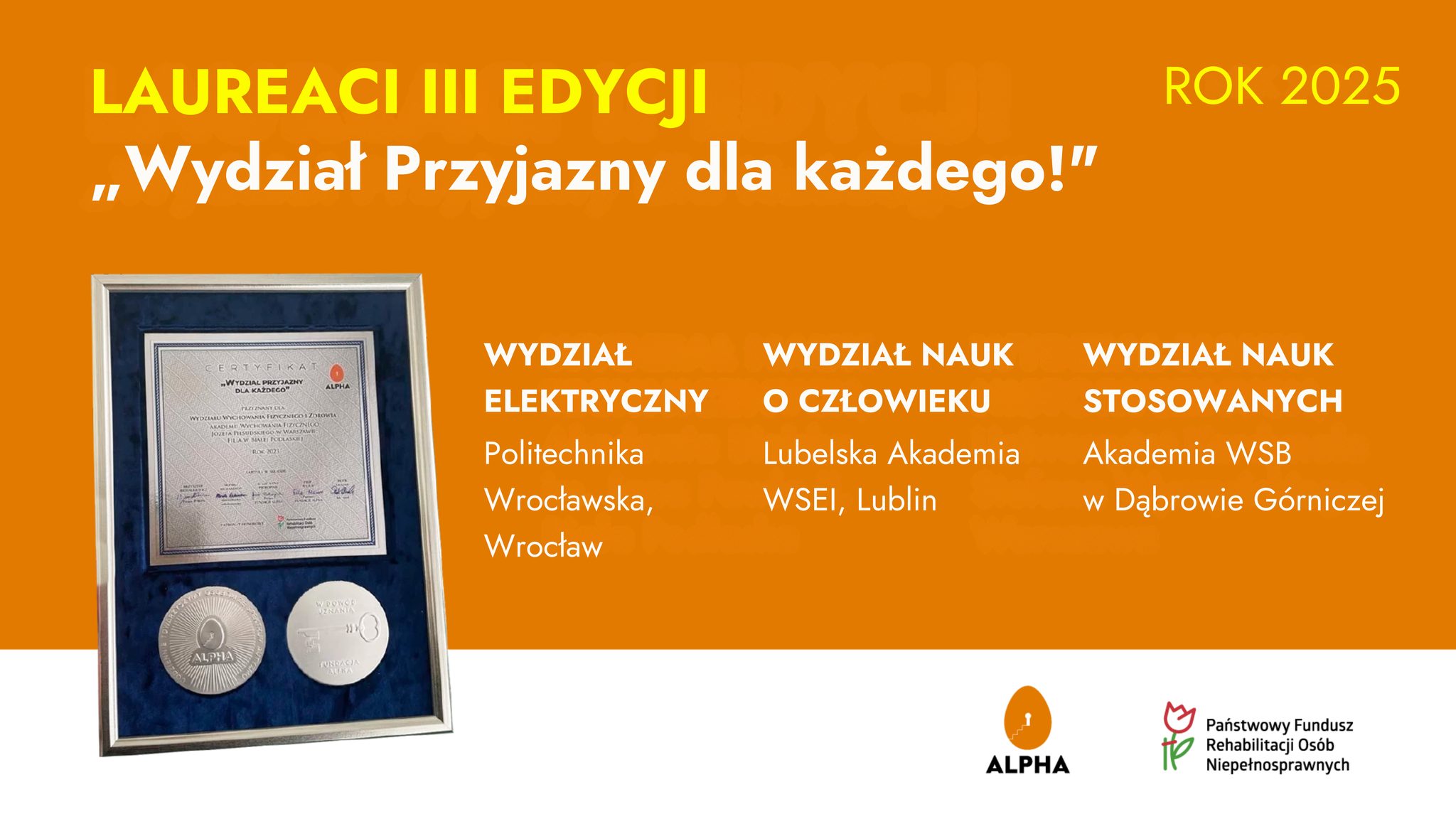 Z ogromną radością informujemy, że Wydział Nauk Stosowanych Akademii WSB w Dąbrowie Górniczej został uhonorowany tytułem „Wydział Przyjazny dla Każdego” w III edycji ogólnopolskiego konkursu organizowanego przez Fundację ALPHA przy wsparciu Państwowego Funduszu Rehabilitacji Osób Niepełnosprawnych.
