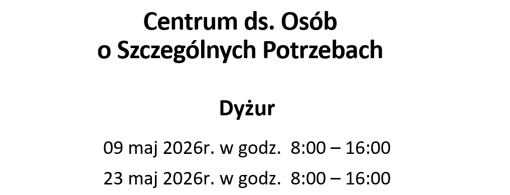 Centrum ds. Osób o Szczególnych Potrzebach uprzejmie informuje o pełnieniu dyżurów w miesiącu kwietniu, które odbywać się będą w następujących terminach i godzinach: