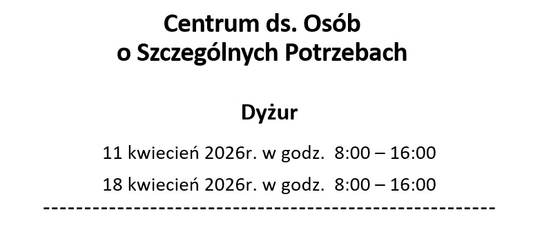 Centrum ds. Osób o Szczególnych Potrzebach uprzejmie informuje o pełnieniu dyżurów w miesiącu kwietniu, które odbywać się będą w następujących terminach i godzinach: