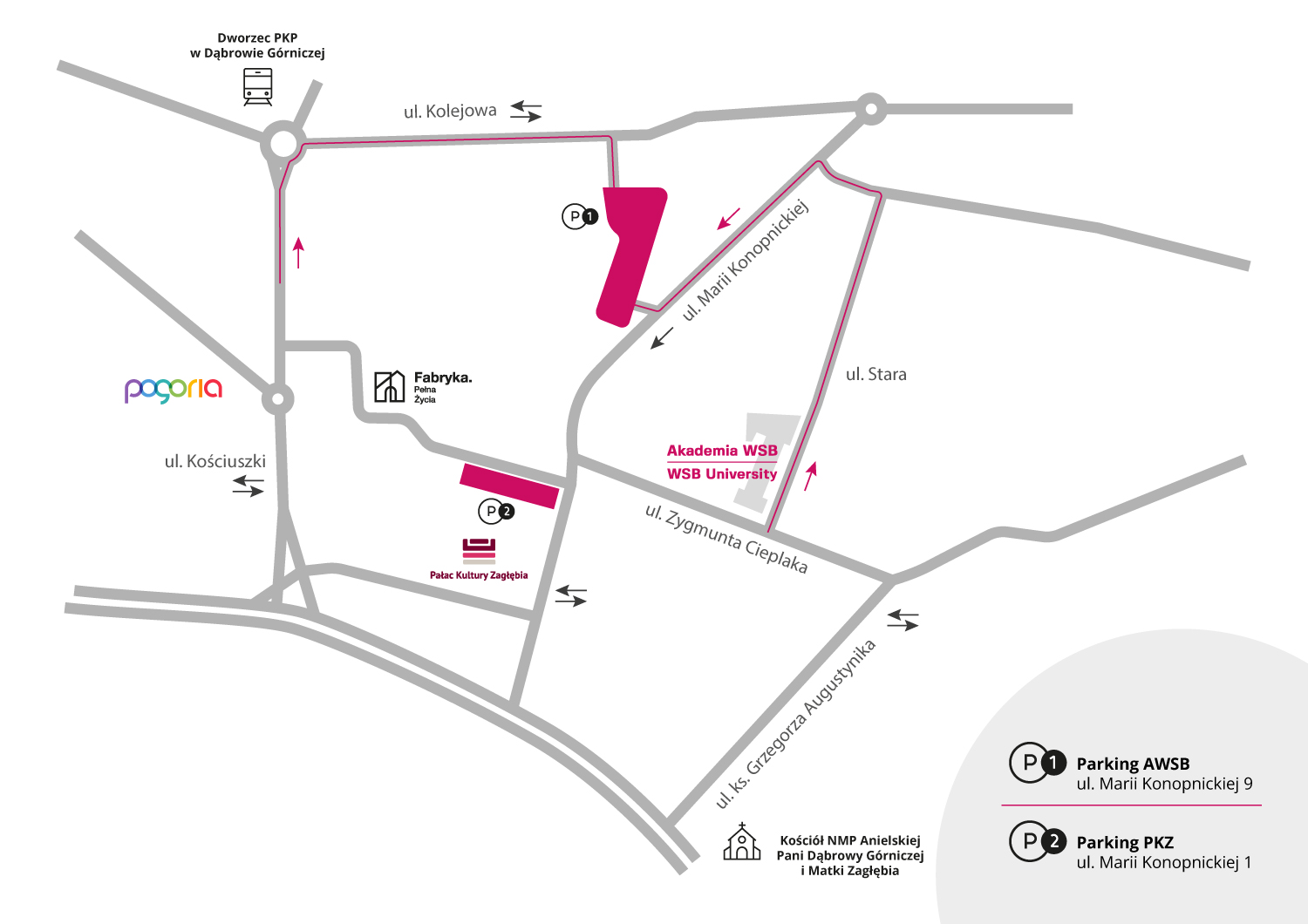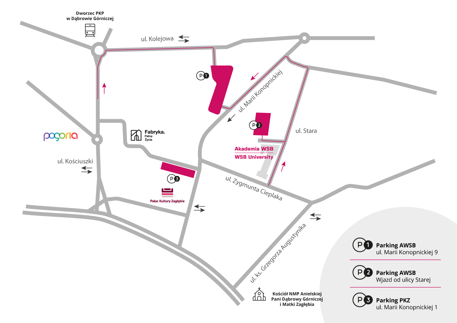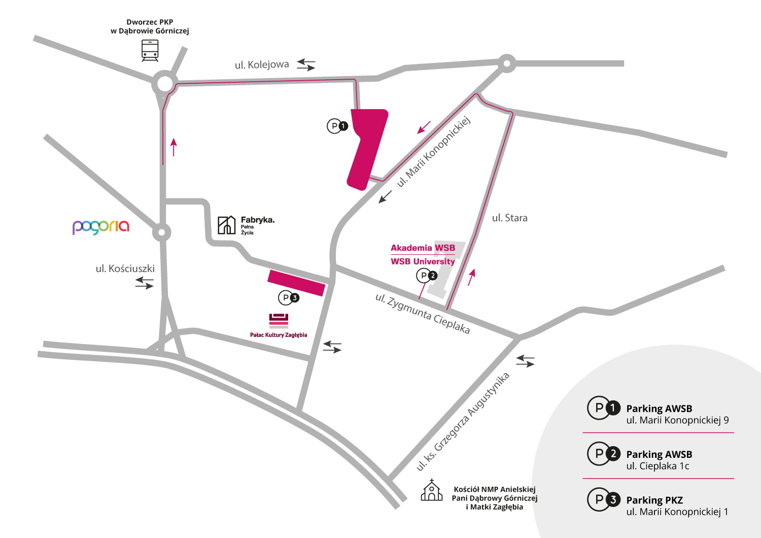 - Przystanek autobusowy po stronie Pałacu Kultury Zagłębia umożliwia dotarcie do budynku Uczelni bez konieczności przekraczania jezdni;