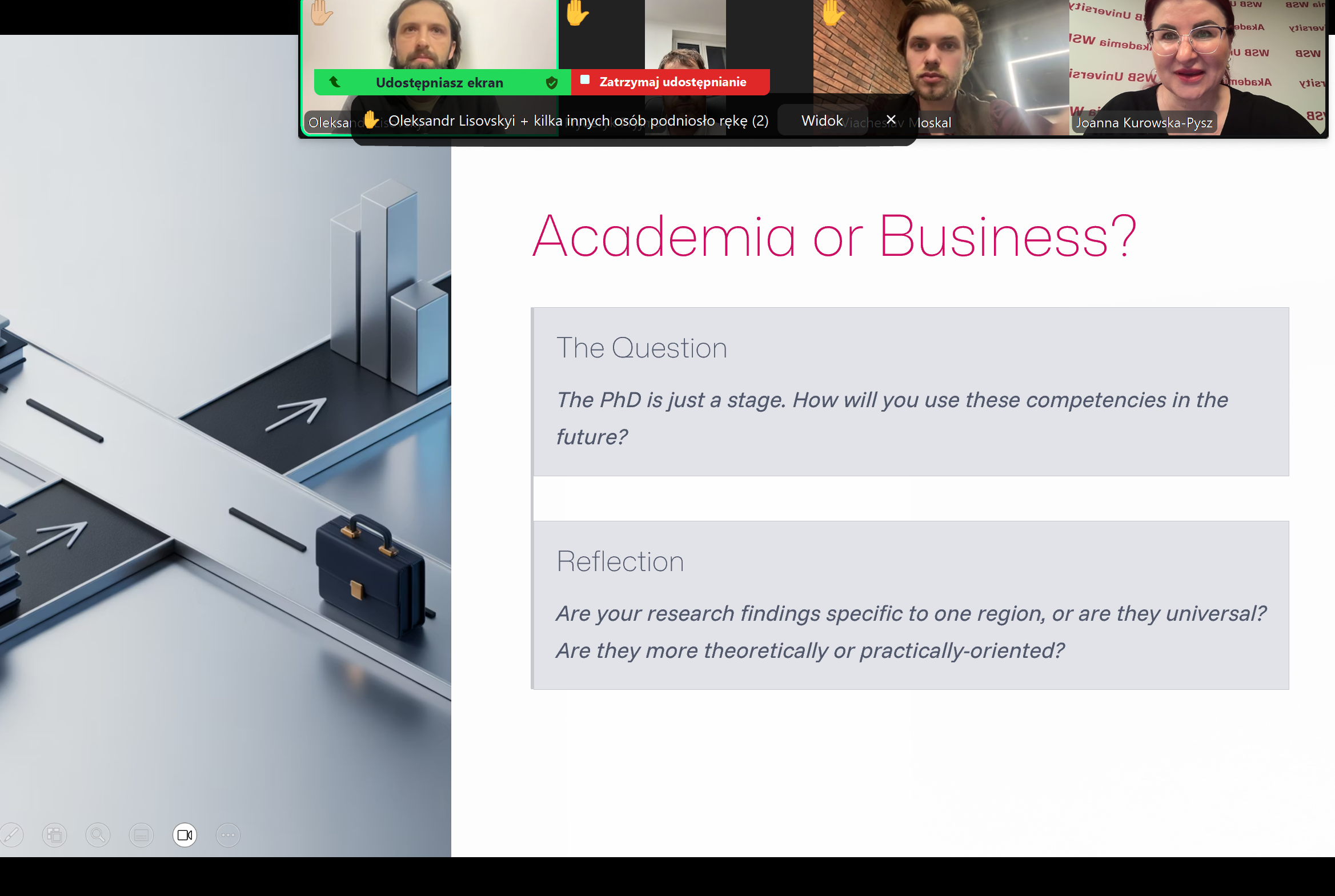 Następnie prof. Joanna Kurowska-Pysz, Zastępca Kierownika Szkoły Doktorskiej Akademii WSB przedstawiła wykład pt. Doctoral Excellence - the foundation of international collaboration in research. W ostatniej części spotkania doktoranci przedstawiali swoje zainteresowania naukowe i zawodowe, a następnie omówiono możliwości rozwoju współpracy naukowej między szkołami doktorskimi działającymi w ramach aliansu Q-Helix.