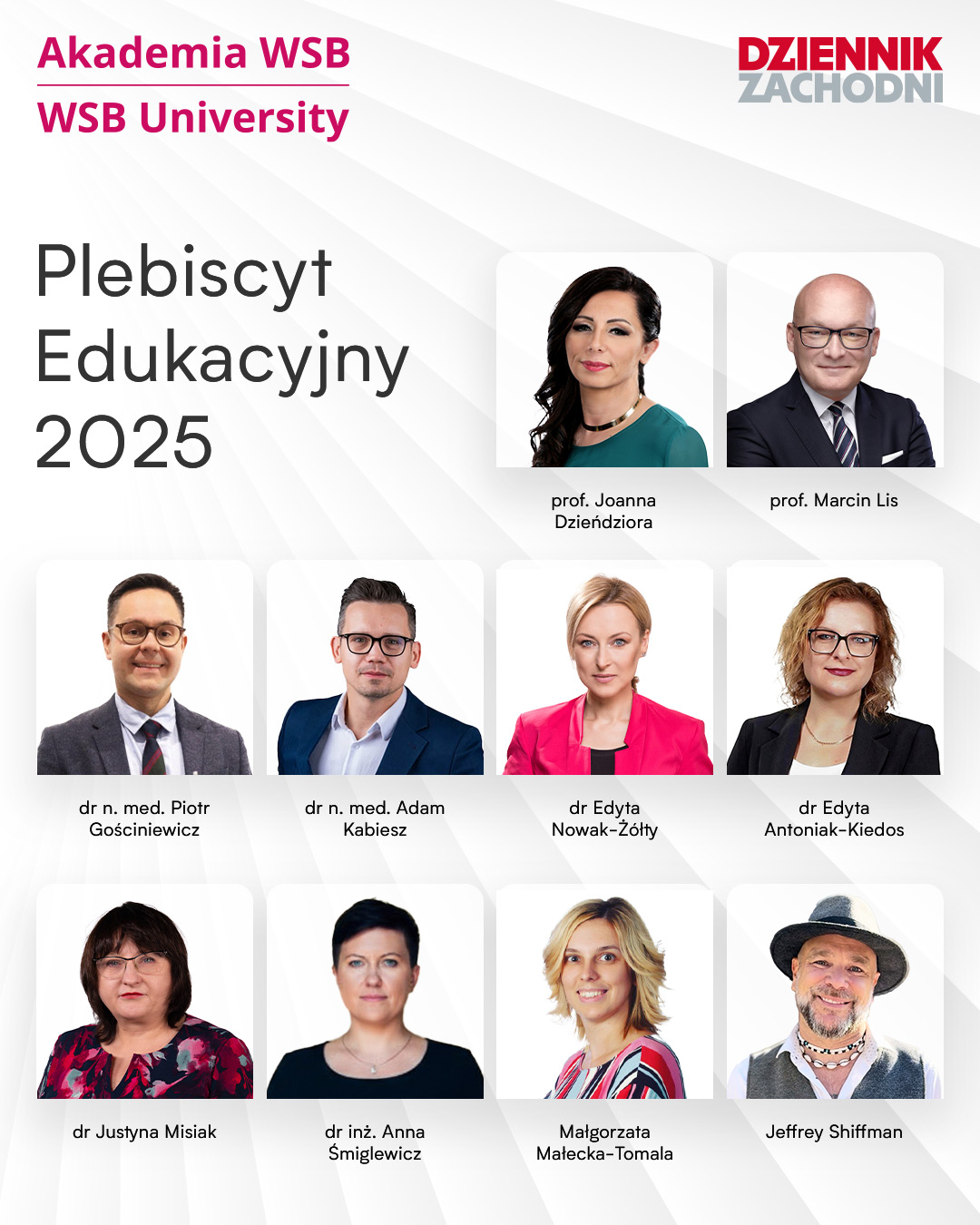 Dziesięciu pracowników Akademii WSB zostało nominowanych do nagrody w kategorii Nauczyciel Akademicki Roku w ogólnopolskim Plebiscycie Edukacyjnym 2025, organizowanym przez Dziennik Zachodni oraz serwis naszemiasto.pl. To jedno z największych przedsięwzięć tego typu w Polsce, którego celem jest uhonorowanie nauczycieli docenianych przez środowisko edukacyjne, studentów oraz rodziców.
