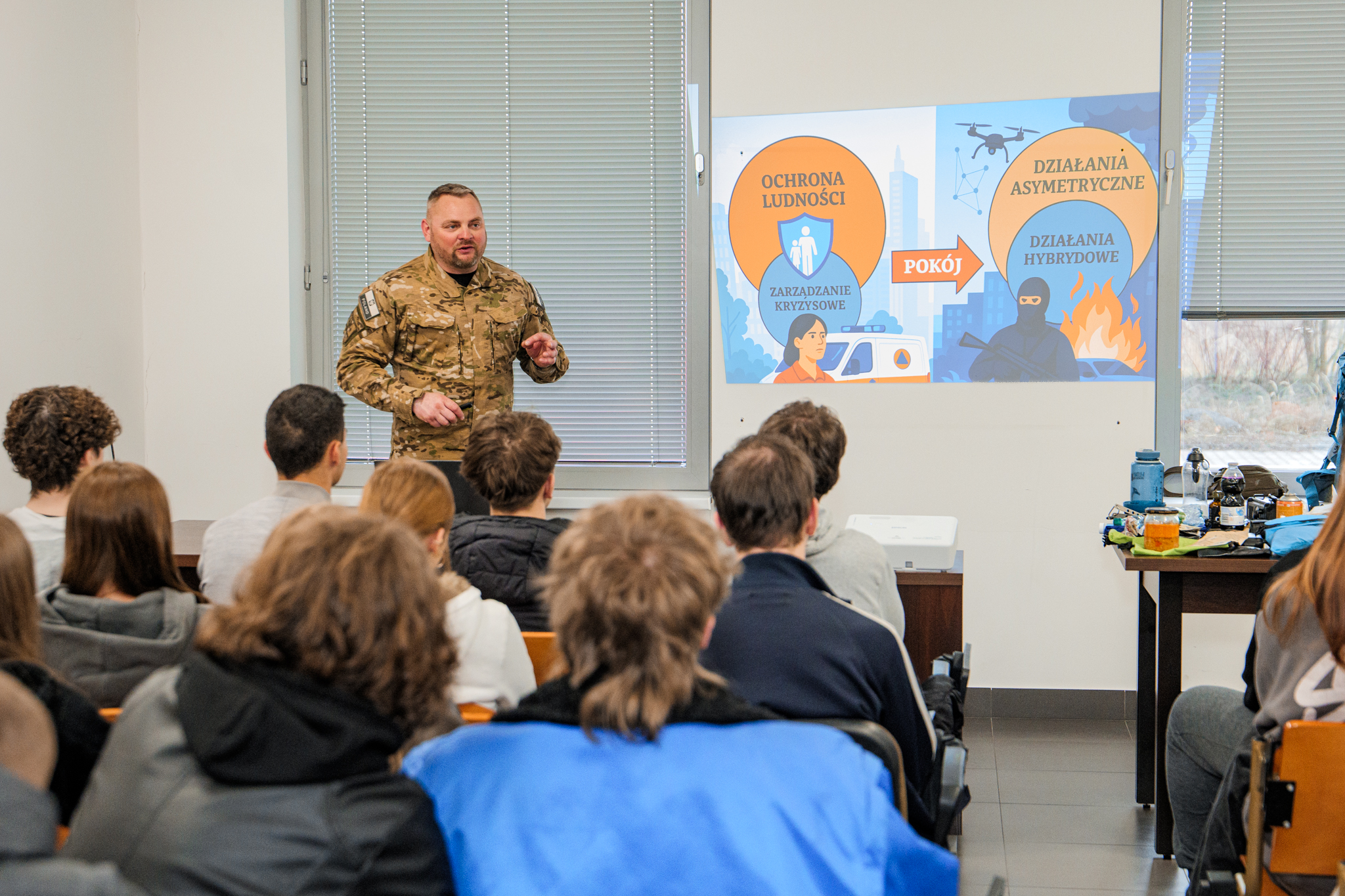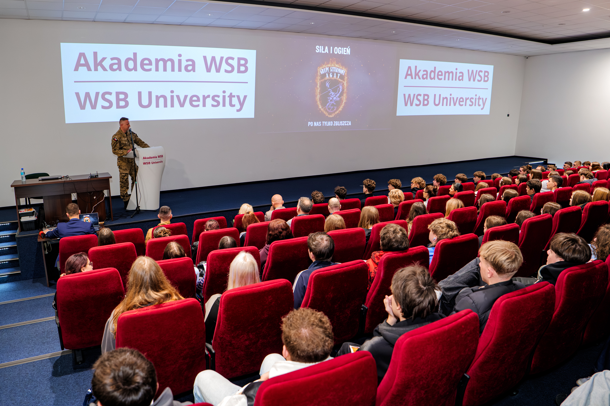 Wydarzenie rozpoczął wykład inauguracyjny płk. Michała Polaszka, Dowódcy Jednostki Wojskowej AGAT, który przybliżył rolę wojsk specjalnych w systemie obrony państwa, wskazując na ich znaczenie w reagowaniu na współczesne zagrożenia. Następnie dr Grzegorz Matuszek, Prodziekan ds. Kształcenia AWSB omówił kluczowe zasady postępowania w sytuacjach kryzysowych, takich jak atak, alarm czy ewakuacja, podkreślając znaczenie świadomości i odpowiedniego przygotowania.