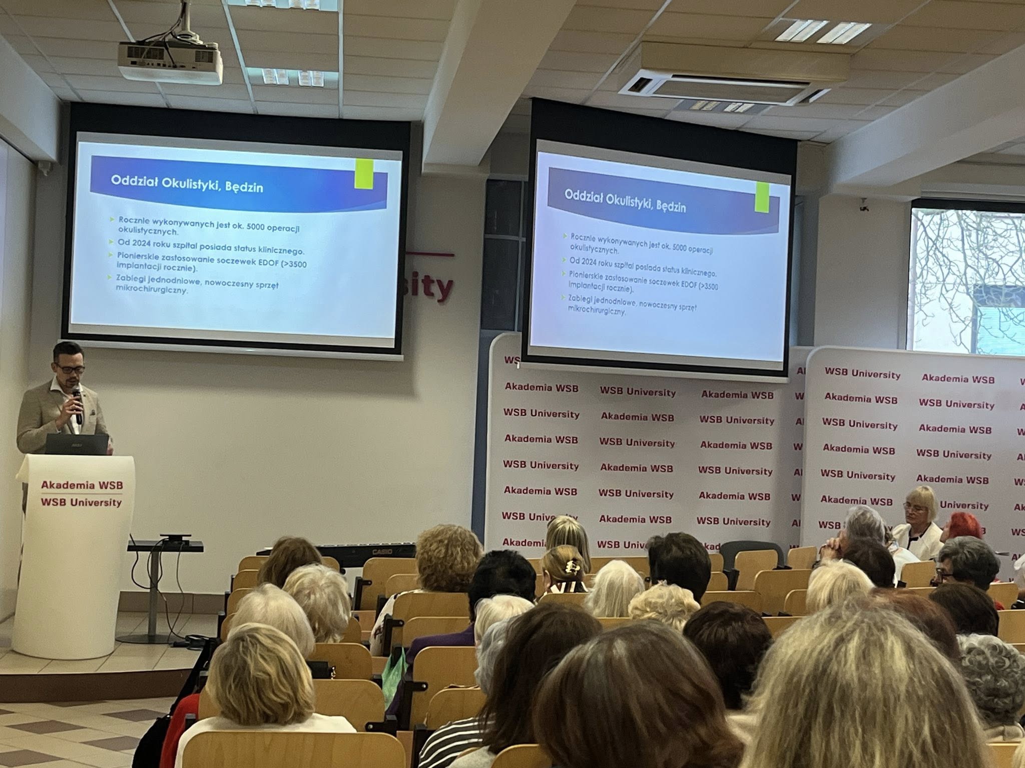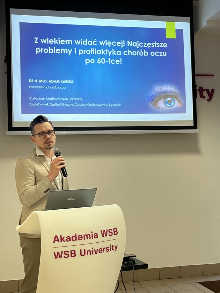 Zwieńczeniem dnia był wykład w ramach cyklu spotkań edukacyjnych UTW. Gościem wydarzenia był dr Adam Kabiesz – prodziekan Collegium Medicum w Akademii WSB oraz specjalista okulistyki z Zagłębiowski Szpital Kliniczny w Będzinie. Tematem wystąpienia było „Z wiekiem widać więcej! O problemach i profilaktyce chorób oczu”. Podczas wykładu uczestnicy mogli dowiedzieć się, jakie zmiany zachodzą w narządzie wzroku wraz z wiekiem, jakie są najczęstsze choroby oczu oraz w jaki sposób można im zapobiegać. Prelegent przekazał wiele praktycznych wskazówek dotyczących codziennej profilaktyki, znaczenia regularnych badań oraz dbania o wzrok w codziennym życiu. Spotkanie spotkało się z dużym zainteresowaniem słuchaczy, którzy aktywnie uczestniczyli w dyskusji i zadawali pytania dotyczące omawianych zagadnień.