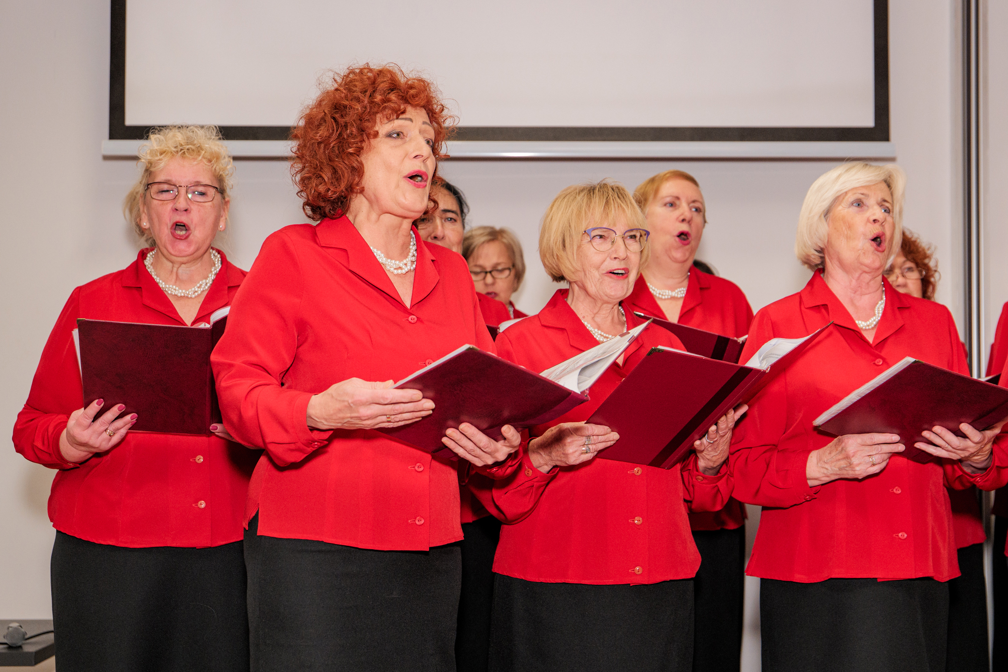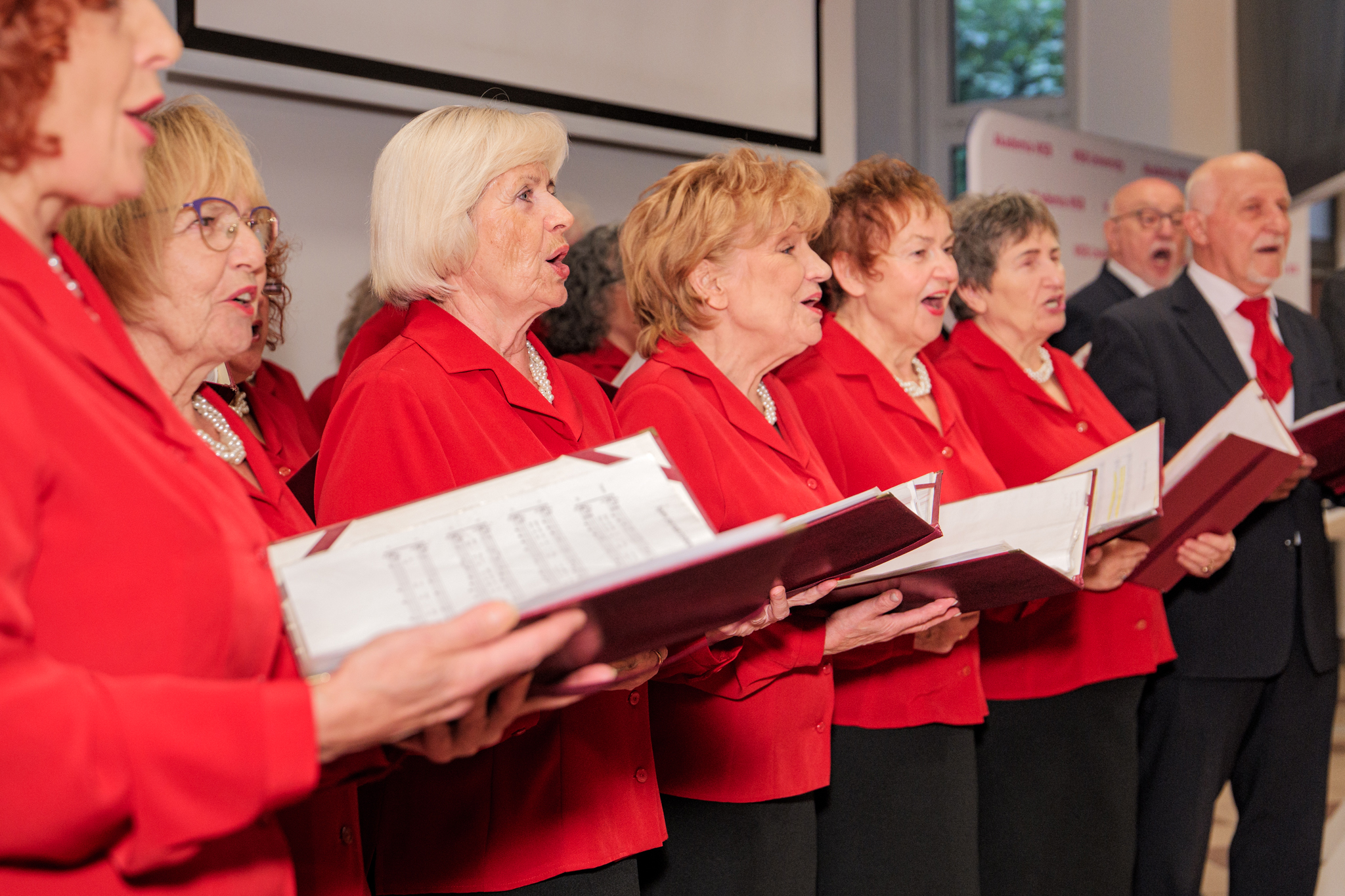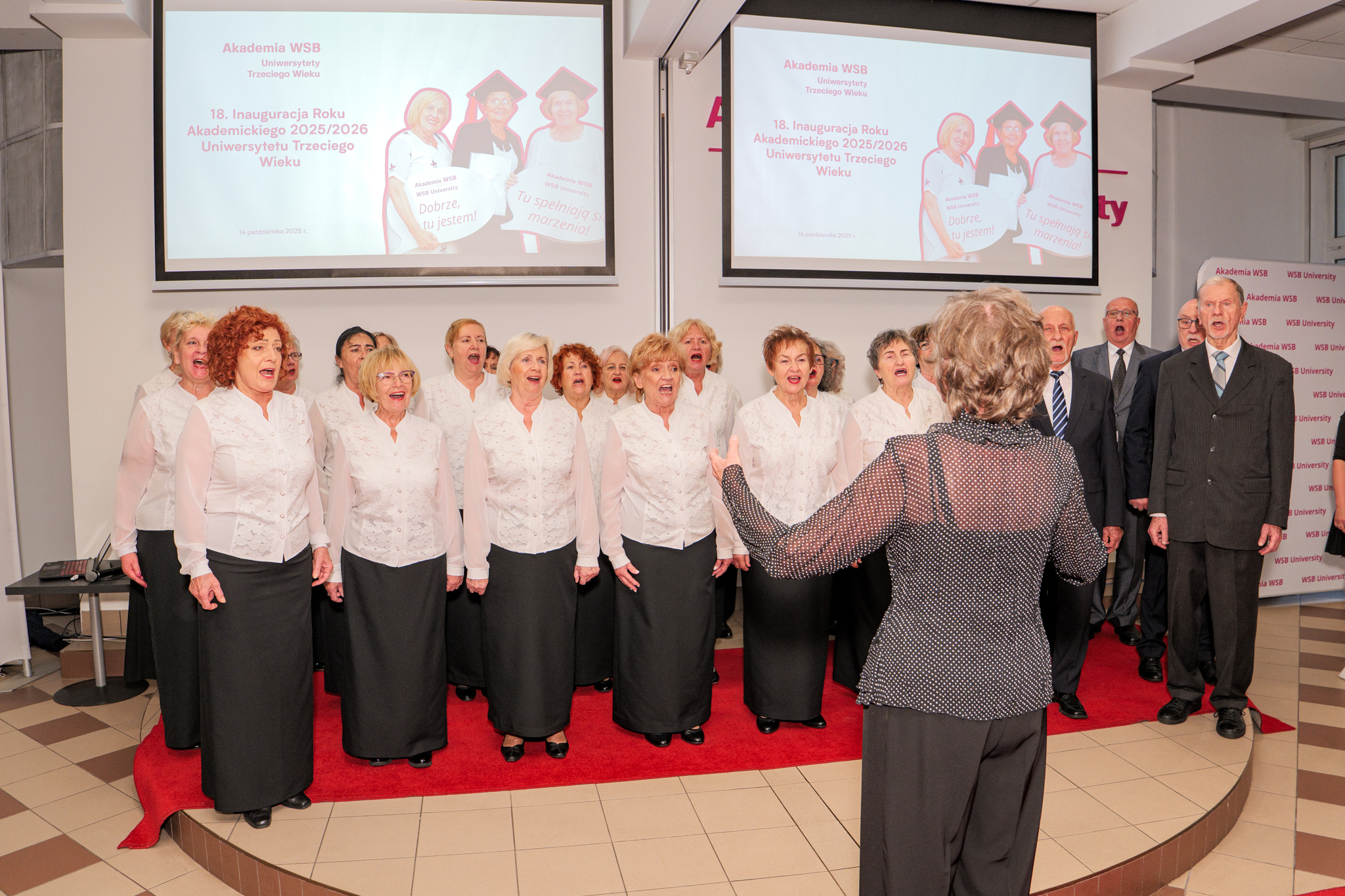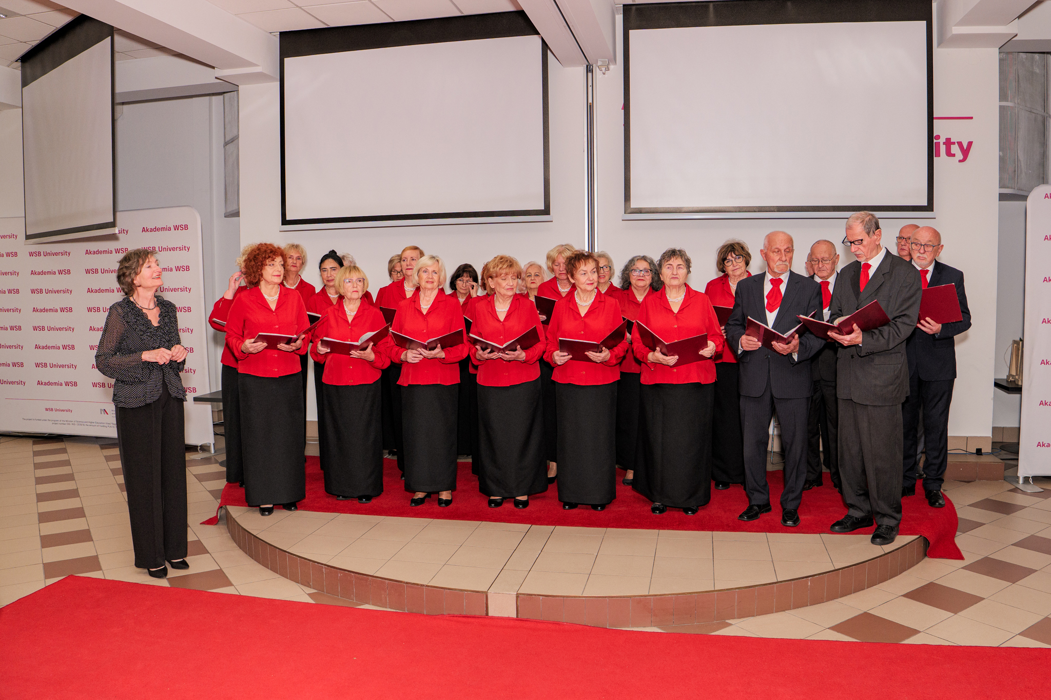 Jednym z najbardziej podniosłych momentów inauguracji była ceremonia immatrykulacji nowych studentów Uniwersytetu Trzeciego Wieku Akademii WSB, którzy symbolicznie zostali przyjęci do grona społeczności akademickiej. Nie zabrakło także wspólnego odśpiewania hymnu „Gaudeamus Igitur”, który w niezwykle piękny i wzruszający sposób wykonał Chór „Wrzosy Jesieni” z Uniwersytetu Trzeciego Wieku w Bytomiu pod kierownictwem Pani Moniki Woleńskiej.