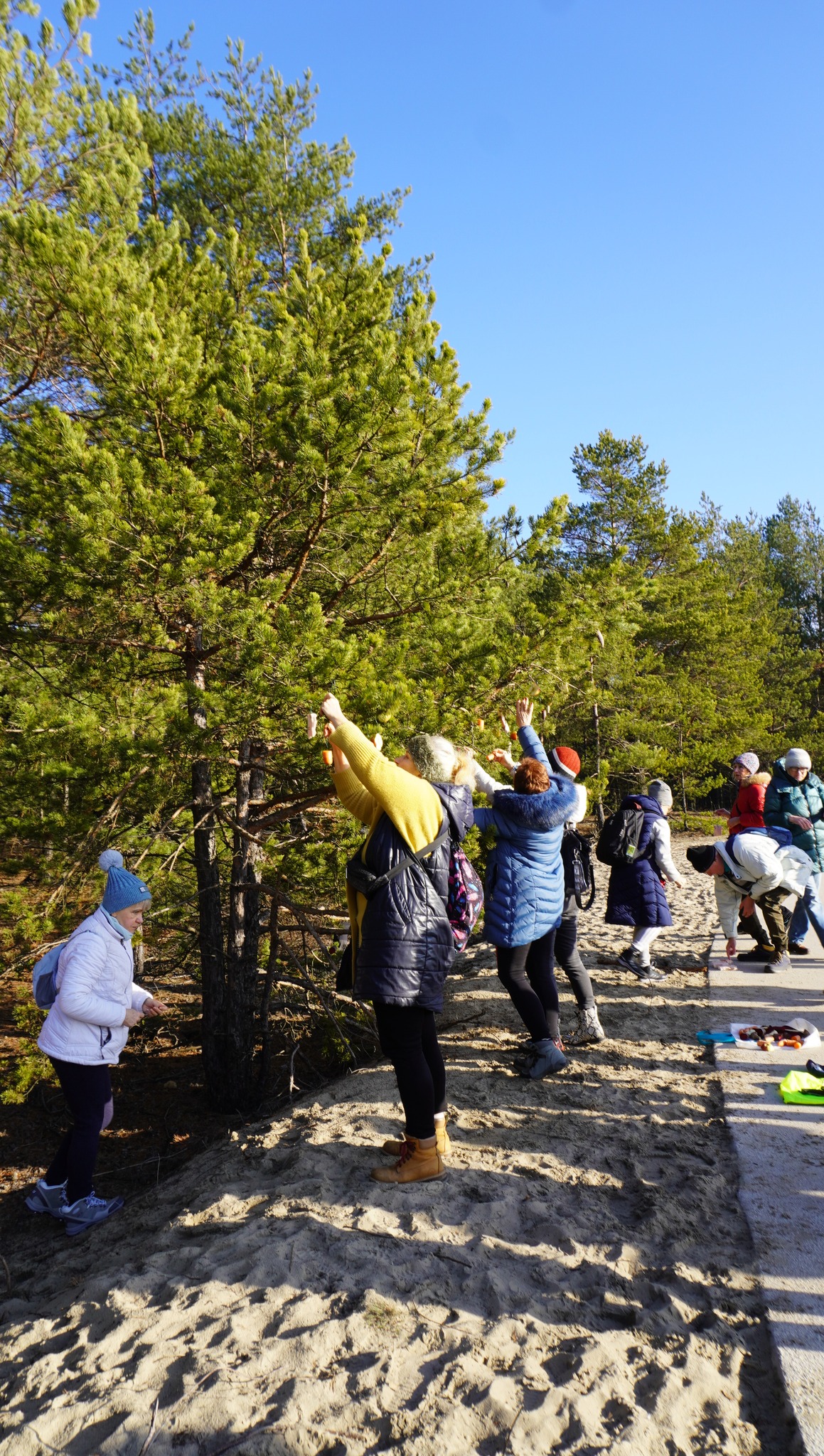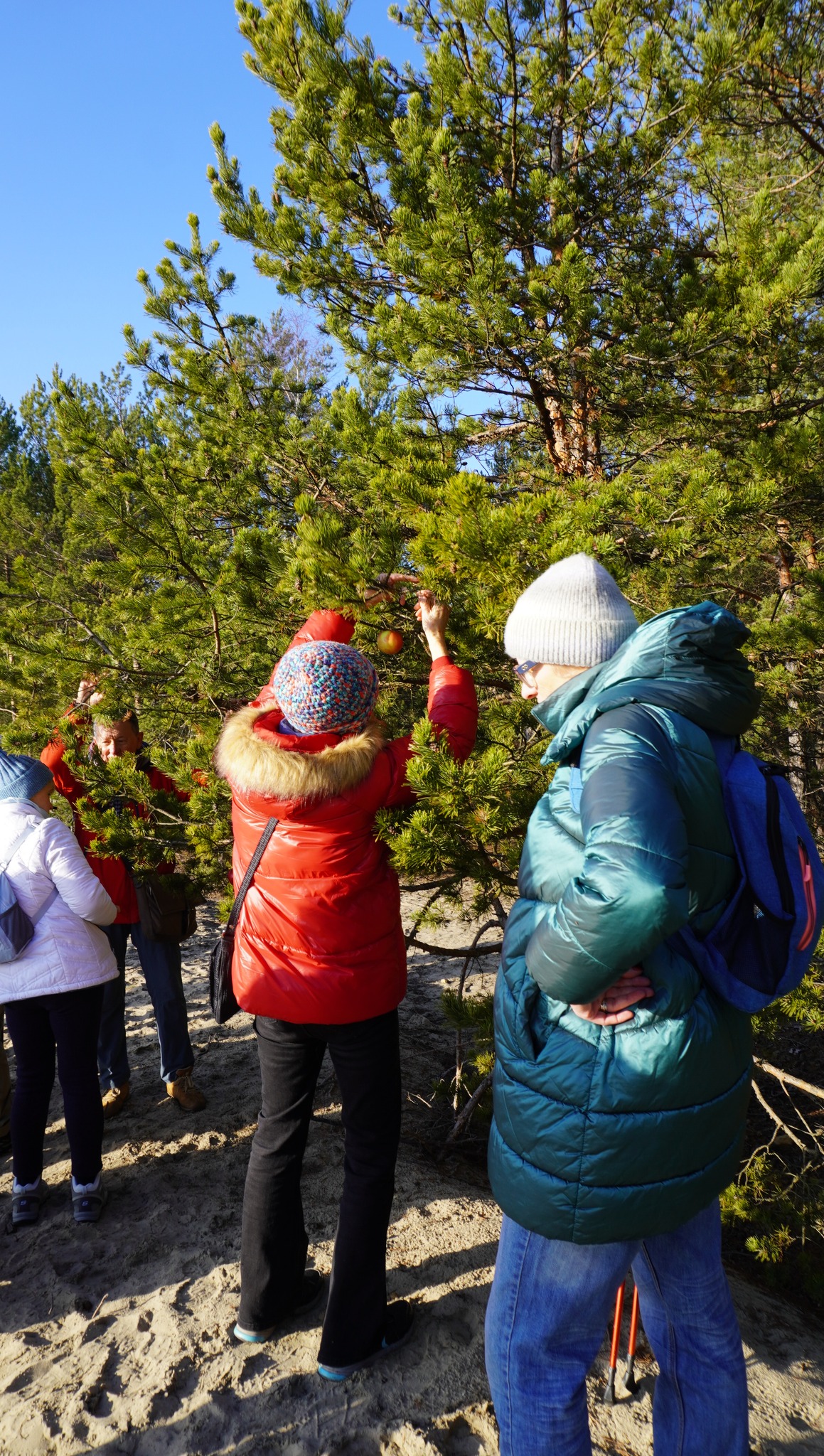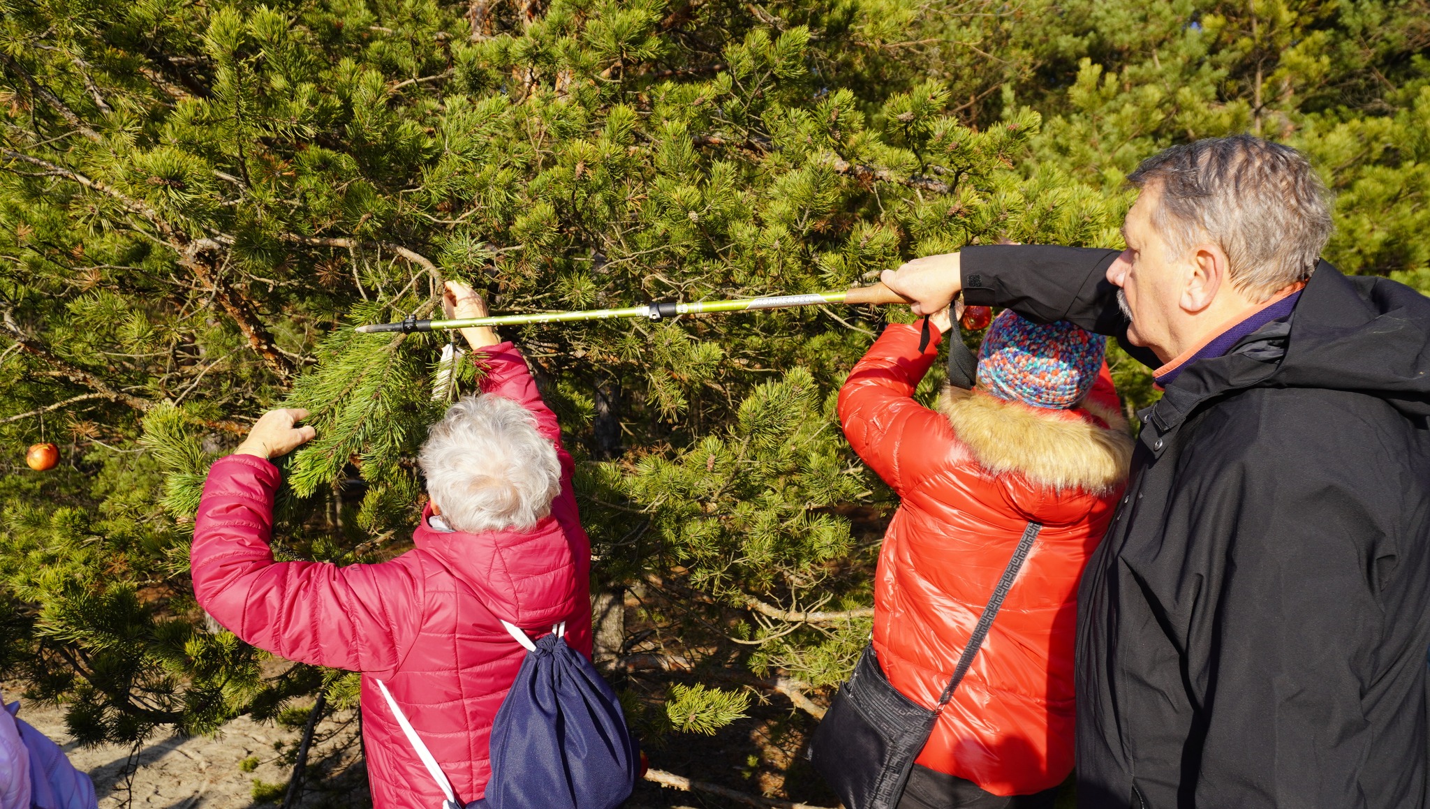 Uczestnicy mieli okazję spędzić ten szczególny czas w otoczeniu natury, w spokojnej i serdecznej atmosferze sprzyjającej rozmowom, wspomnieniom oraz integracji. Wspólny spacer po Pustyni Błędowskiej pozwolił nie tylko podziwiać zimowy krajobraz, ale również poczuć magię zbliżających się Świąt Bożego Narodzenia. Jednym z najbardziej wzruszających momentów wycieczki było wspólne ubieranie ekologicznej choinki, ozdobionej owocami i warzywami, które stanowią naturalny i bezpieczny poczęstunek dla dzikich zwierząt. Była to piękna lekcja troski o przyrodę oraz doskonały przykład, jak w prosty sposób można połączyć świąteczną tradycję z działaniami proekologicznymi. Miłym zwieńczeniem spotkania była możliwość zabrania choinki do domu, aby stała się wyjątkową, świąteczną ozdobą i pamiątką prosto z Pustyni Błędowskiej, wprowadzającą do domów ciepło, radość i świąteczną atmosferę.