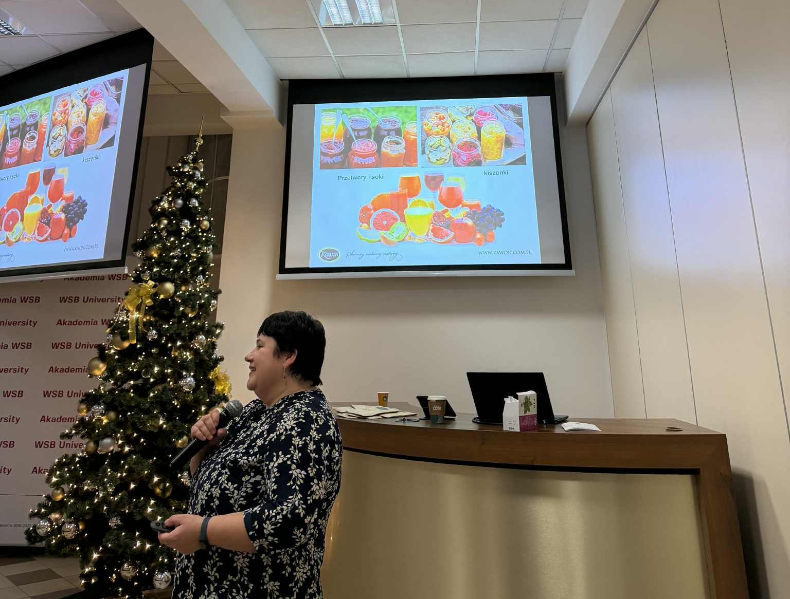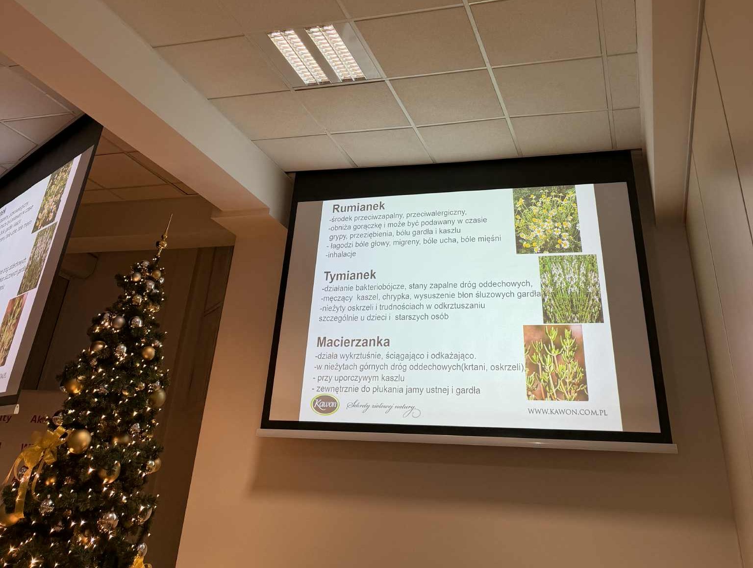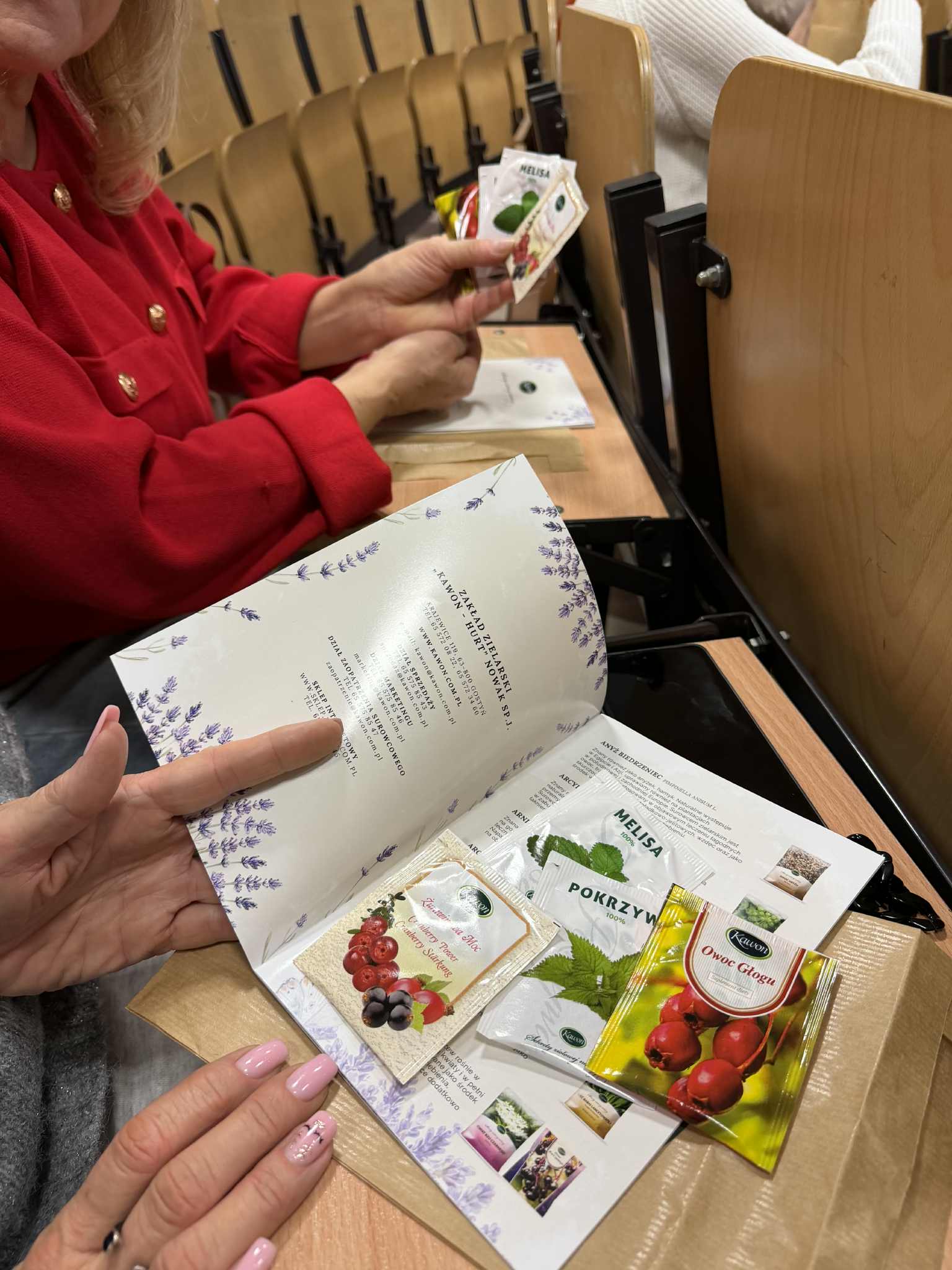 Drugą część spotkania poprowadziła Pani Bernadetta Staśkiewicz, fitoedukator firmy Kawon, z wykładem „Zioła z łąki i ogrodu — co warto znać i zbierać w Polsce”. Podczas prezentacji uczestnicy poznali różnorodne rośliny, ich właściwości prozdrowotne oraz praktyczne sposoby ich wykorzystania w kuchni i domowej apteczce. Pani Bernadetta w ciekawy i przystępny sposób przedstawiła zarówno tradycyjne, jak i mniej znane gatunki ziół, dzieląc się cennymi wskazówkami dotyczącymi ich zbierania, przechowywania i stosowania.