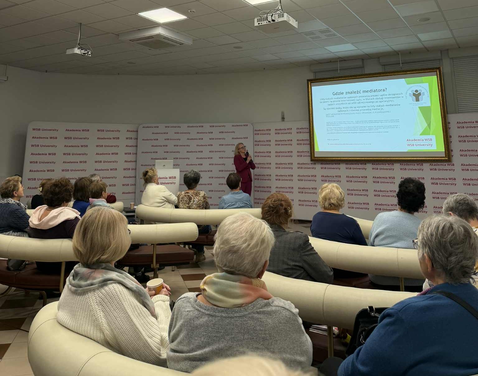Nasze spotkanie rozpoczęła Pani adwokat Marta Imiołczyk-Porębska, która w ramach Tygodnia Mediacji poprowadziła prelekcję pt. „Mediacja — sztuka porozumiewania się”. W trakcie wykładu słuchacze mogli poznać zasady budowania porozumienia, skutecznej komunikacji oraz różne metody rozwiązywania konfliktów. Pani Marta podzieliła się praktycznymi wskazówkami, które pomagają w codziennych sytuacjach zarówno w życiu zawodowym, jak i prywatnym, pokazując, że mediacja to nie tylko narzędzie prawne, ale przede wszystkim umiejętność słuchania i rozumienia drugiej strony.