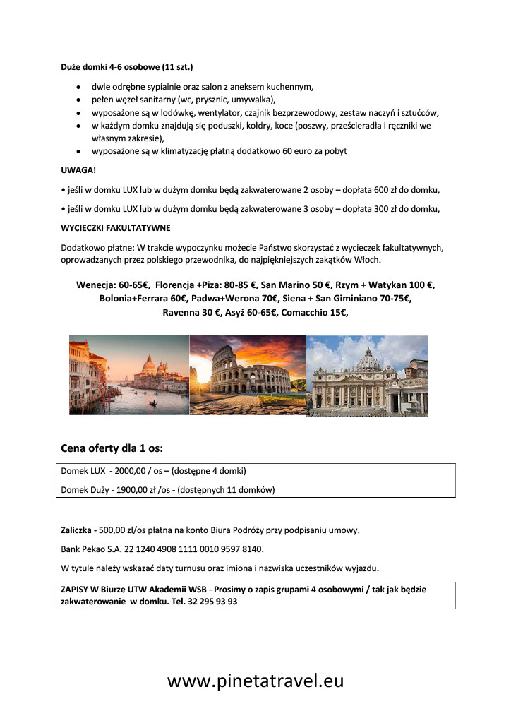 Dodatkowo płatne: W trakcie wypoczynku możecie Państwo skorzystać z wycieczek fakultatywnych, oprowadzanych przez polskiego przewodnika, do najpiękniejszych zakątków Włoch.