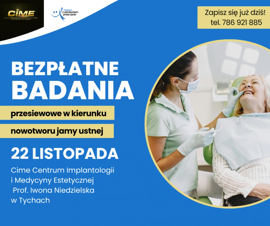 W ramach Kampanii, Fundacja do walki z nowotworem jamy ustnej „Z uśmiechem przez życie” we współpracy z gabinetem CIME Centrum Implantologii i Medycyny Estetycznej, zaprasza mieszkańców Tychów na bezpłatne badania przesiewowe w kierunku raka jamy ustnej. To doskonała okazja, by zadbać o swoje zdrowie i dowiedzieć się więcej o tym, jak zapobiegać chorobom nowotworowym jamy ustnej.