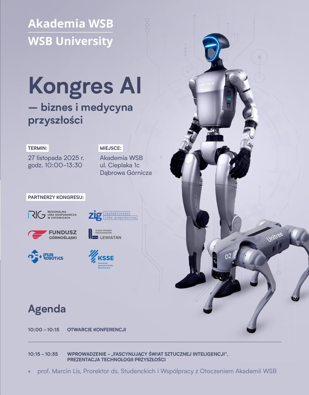 Serdecznie zapraszamy do udziału w Kongresie „AI – biznes i medycyna przyszłości”, który odbędzie się 27 listopada 2025 roku w Audytorium Maximum Akademii WSB (ul. Cieplaka 1c, Dąbrowa Górnicza).
