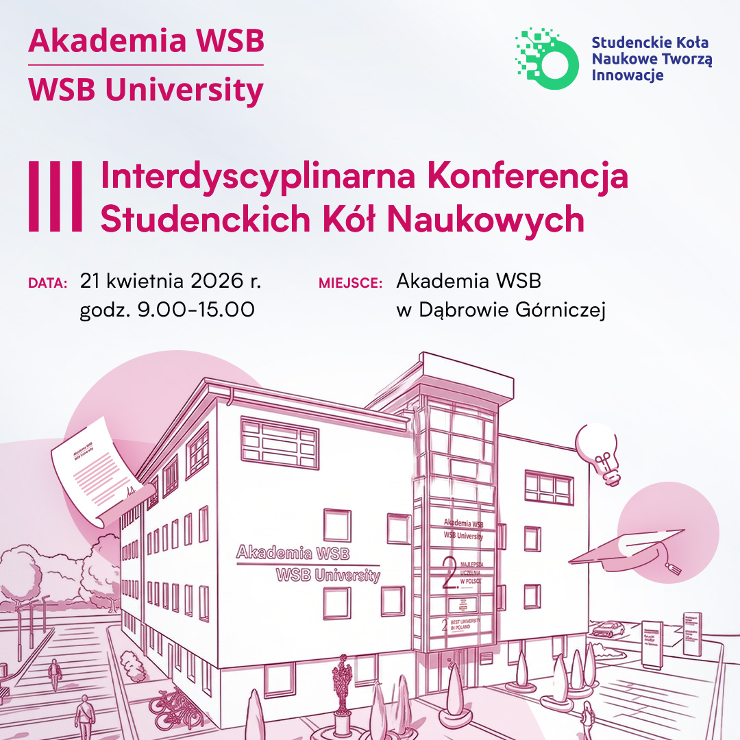 Zapraszamy na lll Interdyscyplinarną Konferencję Studenckich Kół Naukowych, która odbędzie się 21 kwietnia 2026 r. w Akademii WSB w Dąbrowie Górniczej.
