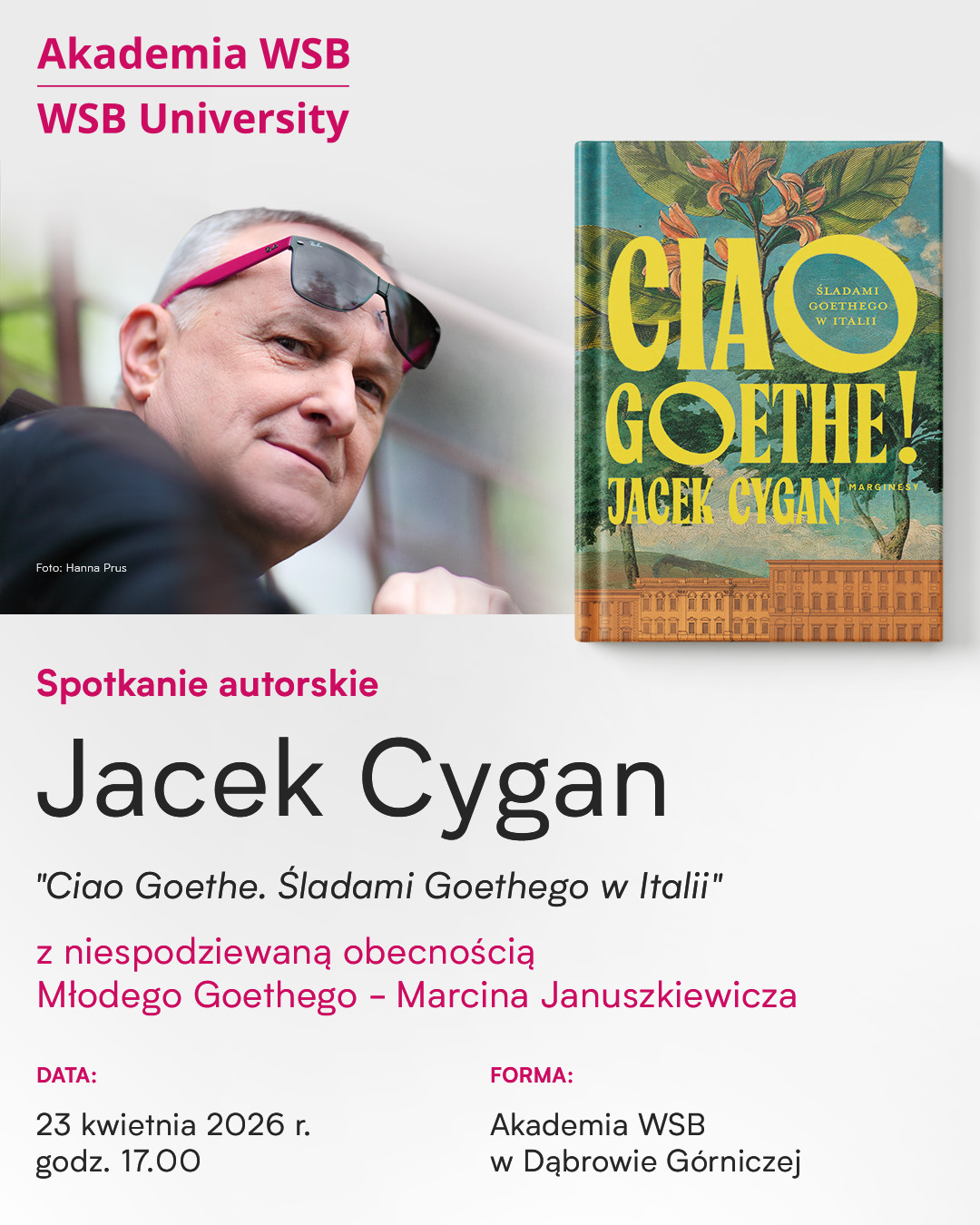 w imieniu JM Rektor Akademii WSB prof. Zdzisławy Dacko-Pikiewicz, uprzejmie zapraszamy Państwa wraz z rodziną i przyjaciółmi na spotkanie autorskie z Jackiem Cyganem, doktorem honoris causa Akademii WSB, autorem książki „Ciao Goethe. Śladami Goethego w Italii”, podczas którego wystąpi wraz z Marcinem Januszkiewiczem.