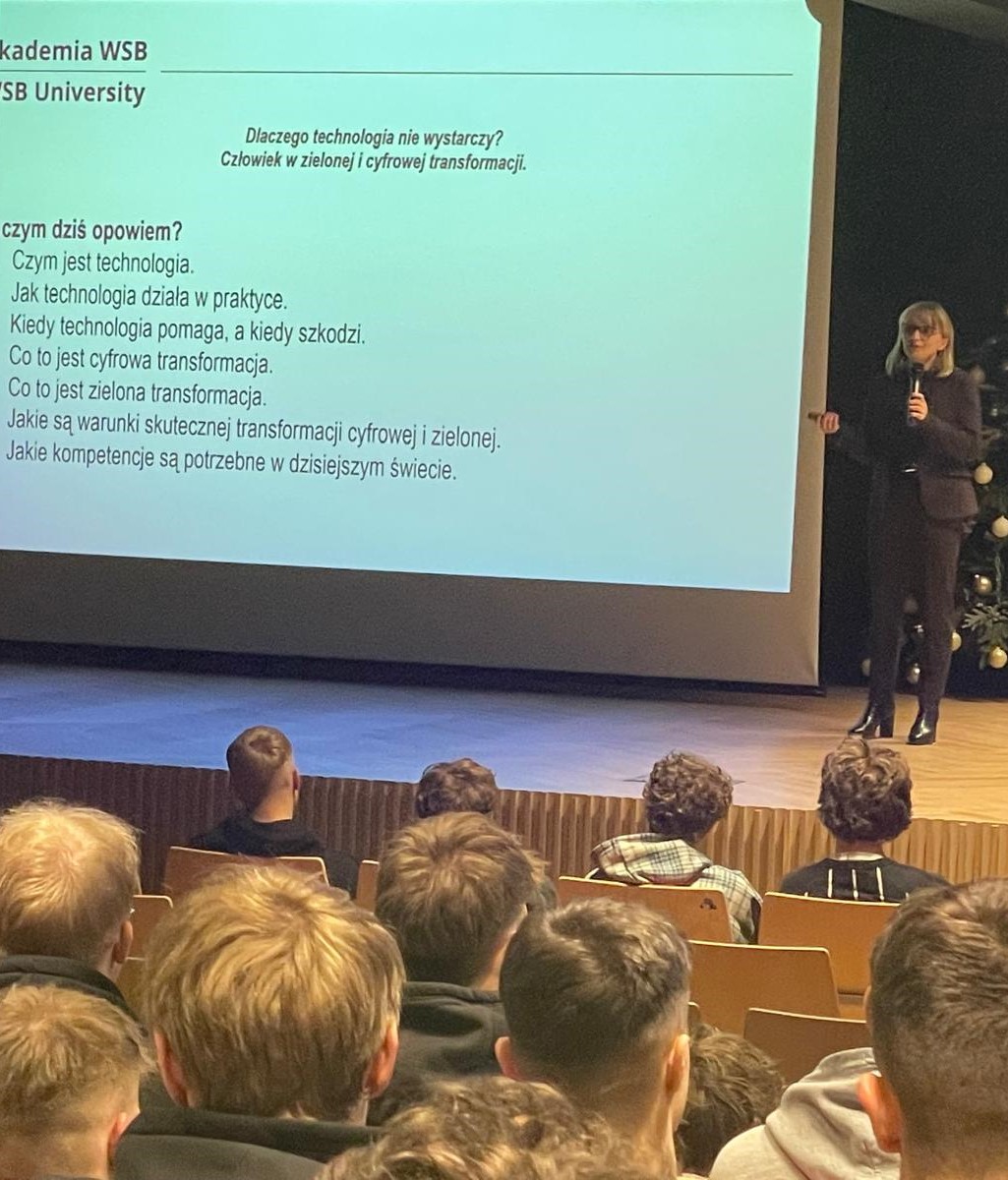 Spotkanie rozpoczął Dziekan Akademii WSB w Żywcu, dr Dariusz Trojszczak, który przywitał uczestników i przedstawił kilka ważnych informacji na temat uczelni. Wydarzenie było skierowane do uczniów Zespołu Szkół Mechaniczno-Elektrycznych i odbyło się w Auli Branżowego Centrum Umiejętności. Wykład poświęcony był roli człowieka i kompetencji społecznych w procesach transformacji cyfrowej i zielonej.