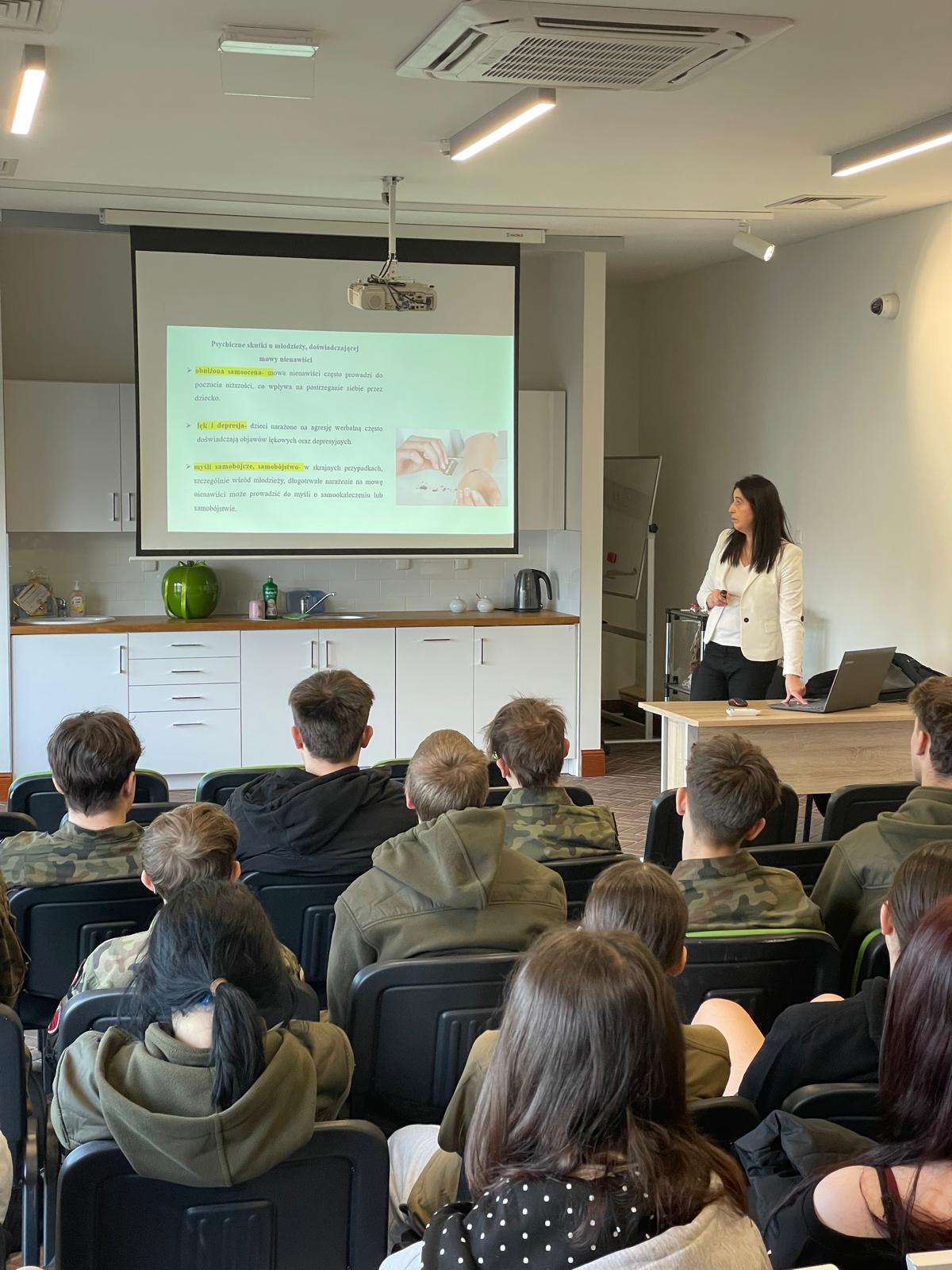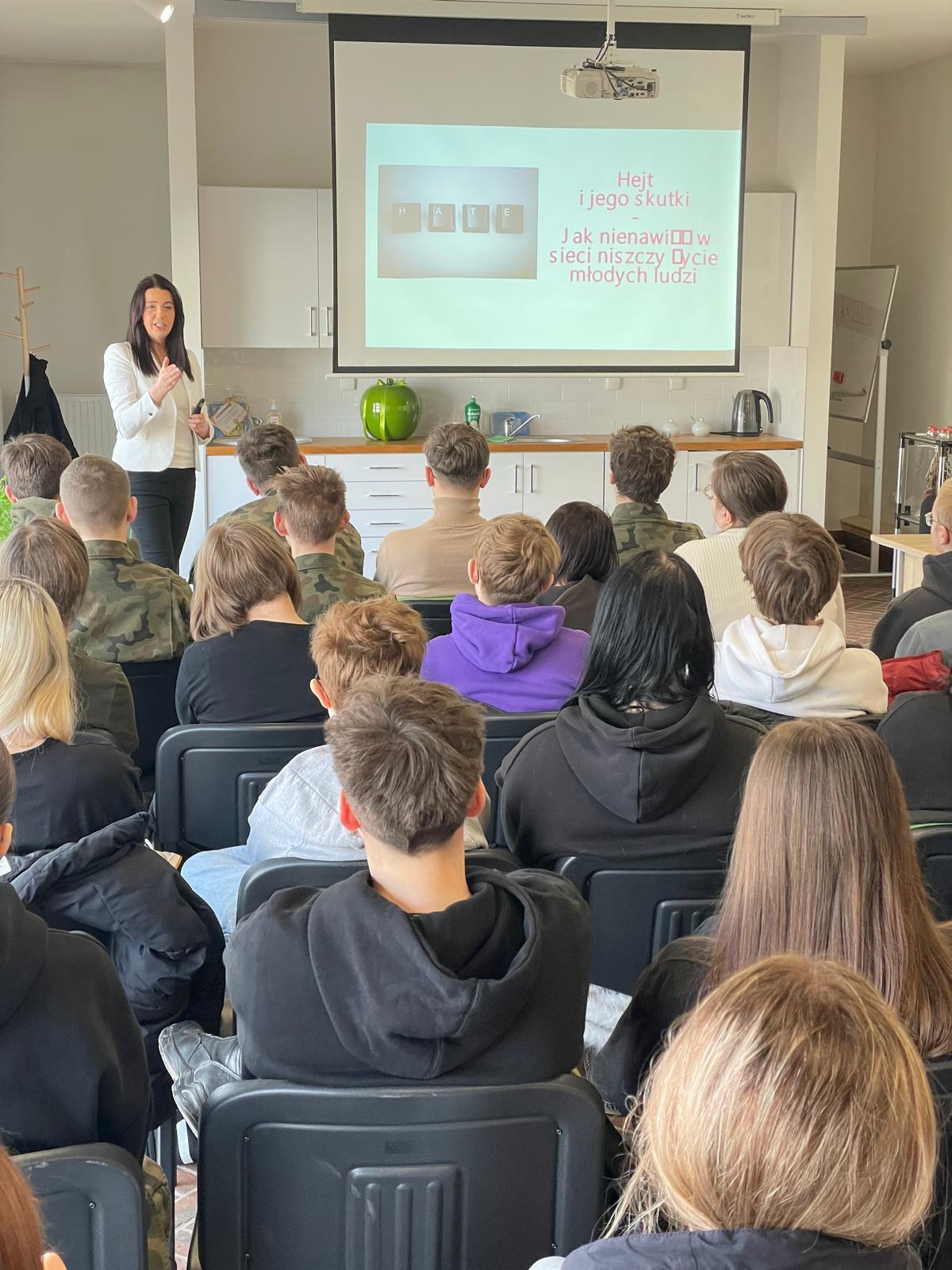 Wykład poprowadziła dr Violetta Bętkowska, Prodziekan Akademii WSB w Cieszynie. Dr Bętkowska przybliżyła uczniom tematykę hejtu — jego genezę, społeczne konsekwencje oraz sposoby przeciwdziałania negatywnym zjawiskom w komunikacji internetowej i codziennym życiu. Celem wykładu było podniesienie świadomości młodzieży na temat mechanizmów hejtu oraz promowanie postaw opartych na szacunku i odpowiedzialności za słowo.