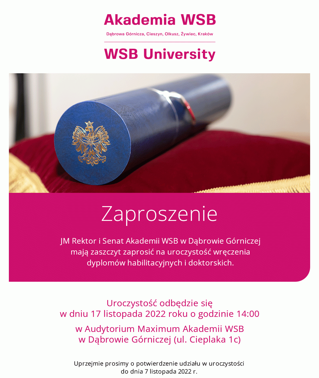 Serdecznie zapraszamy na uroczystość promocji habilitacyjnych i doktorskich, która odbędzie się 17 listopada 2022 r. o godzinie 14.00 w Audytorium Maximum Akademii WSB.