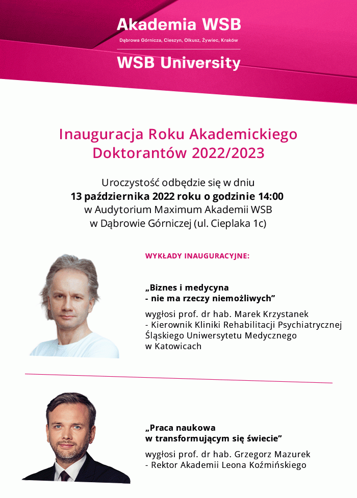 Serdecznie zapraszamy na Inaugurację Roku Akademickiego dla Doktorantów, która odbędzie się 13 października 2022 r. o godzinie 14.00 w Audytorium Maximum Akademii WSB.
