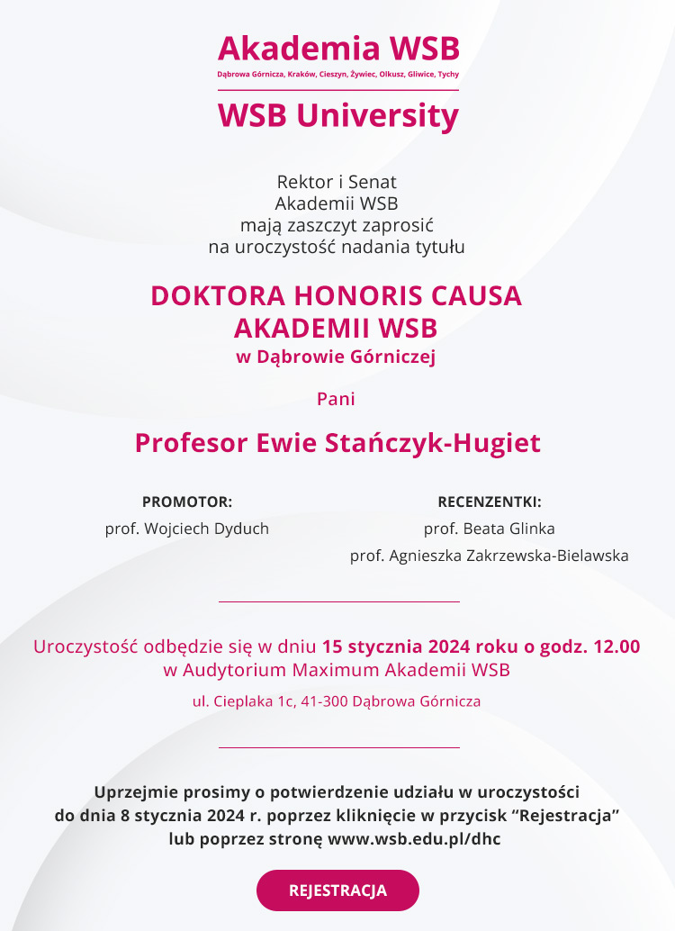Uroczystość nadania tytułu DOKTORA HONORIS CAUSA Akademii WSB Pani Profesor Ewie Stańczyk-Hugiet