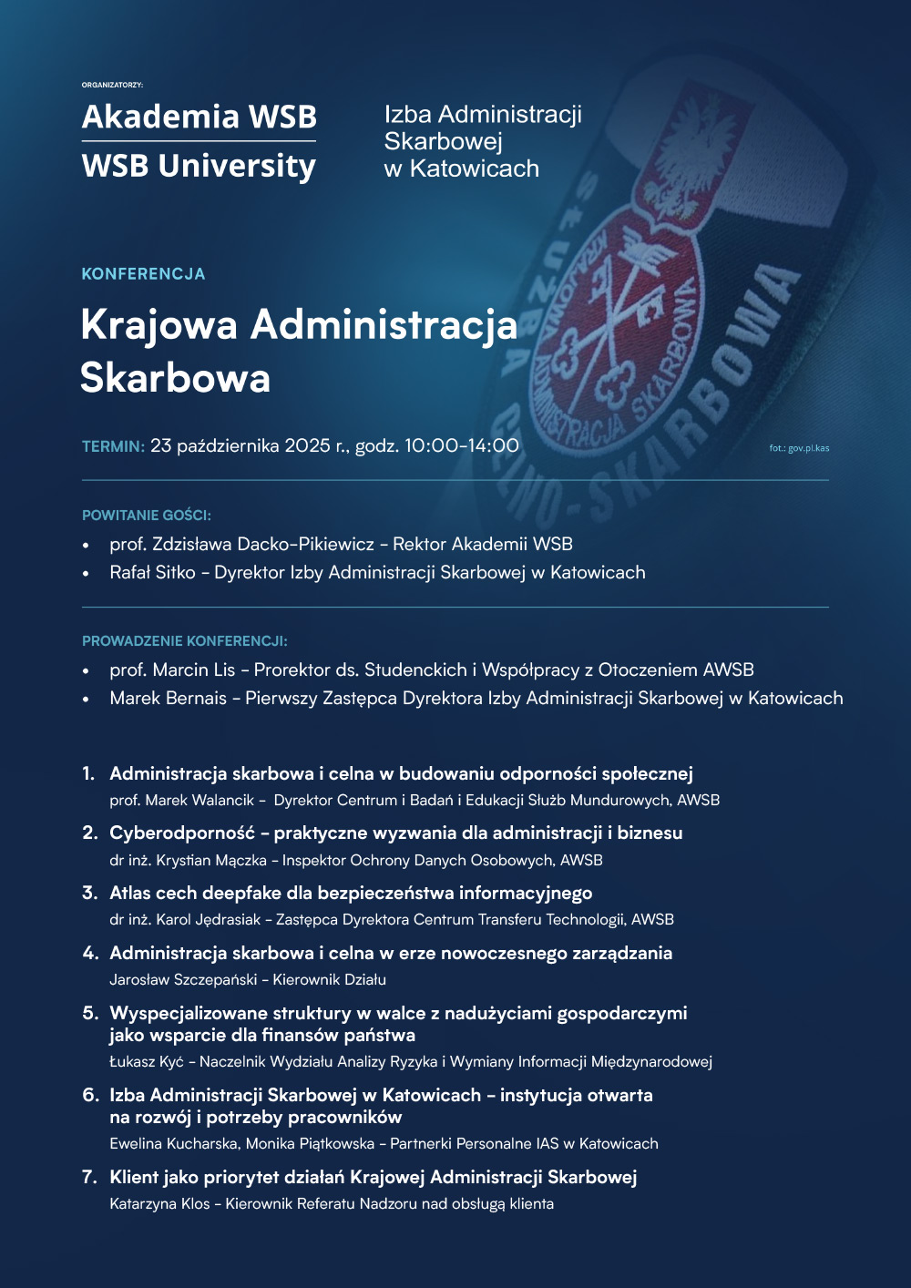 Wśród prelegentów znajdą się funkcjonariusze, specjaliści i eksperci Izby Administracji Skarbowej w Katowicach: Jarosław Szczepański, Łukasz Kyć, Ewelina Kucharska, Monika Piątkowska, Katarzyna Klos oraz grono eksperckie Akademii WSB: prof. Marek Walancik, dr inż. Krystian Mączka, dr inż. Karol Jędrasiak.
