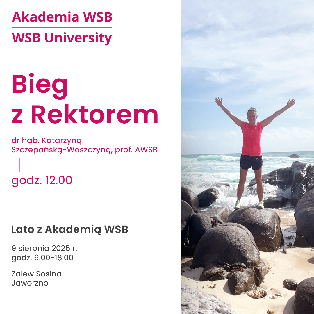 Serdecznie zapraszamy na wydarzenie organizowane przez Akademię WSB, Bieg z Rektorem, które odbędzie się nad Zalewem Sosina w Jaworznie w dniu 9 sierpnia 2025 roku.